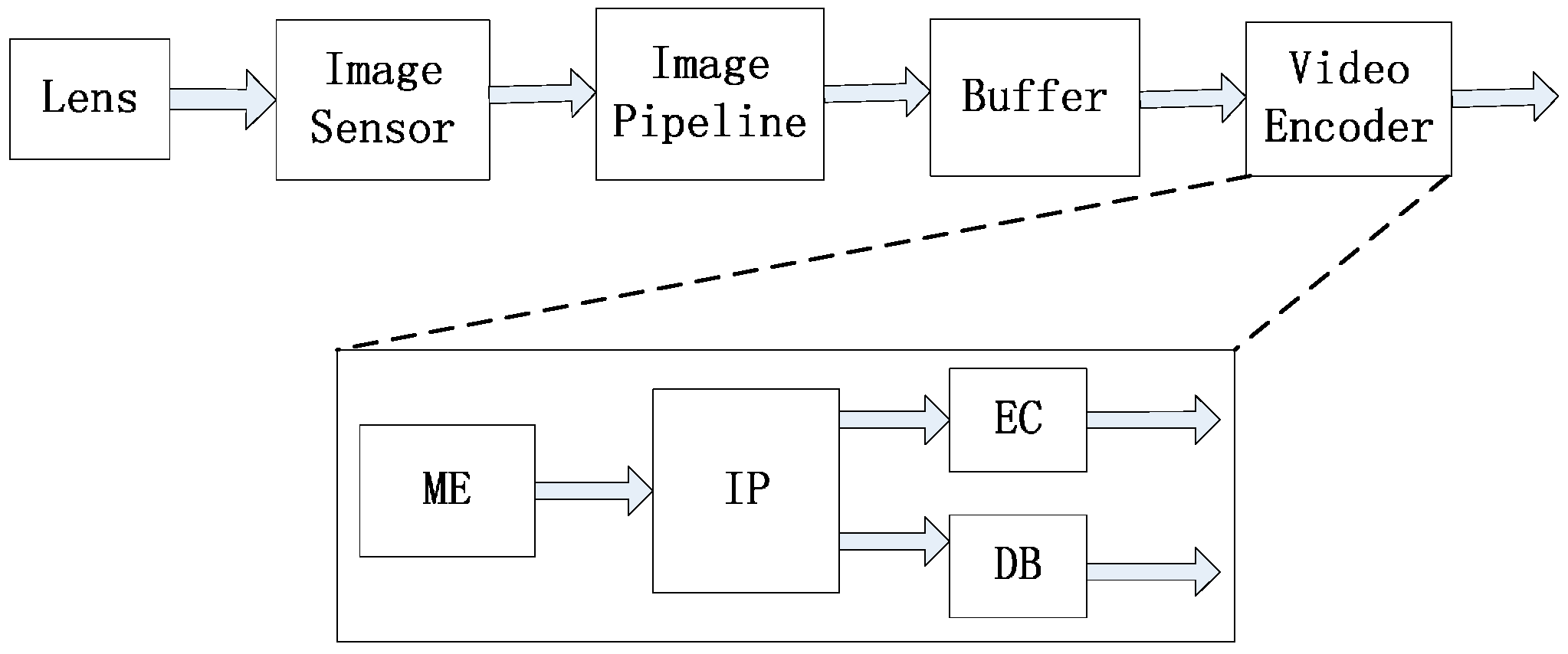 Figure 2 shows the data flow for a video-acquisition system mainly including an image sensor with video compression. The lens and image sensor are used to acquire the raw image. The image pipeline processes the pixels from the image sensor to restore vivid videos. A buffer is used to reorder line scan pixels to block scan ones. The video encoder compresses the video from the buffer and output the compressed Bitstream for transmission. In the video encoder, ME is used to reduce temporal redundancy among adjacent frames for video compression (VC-ME) [3].