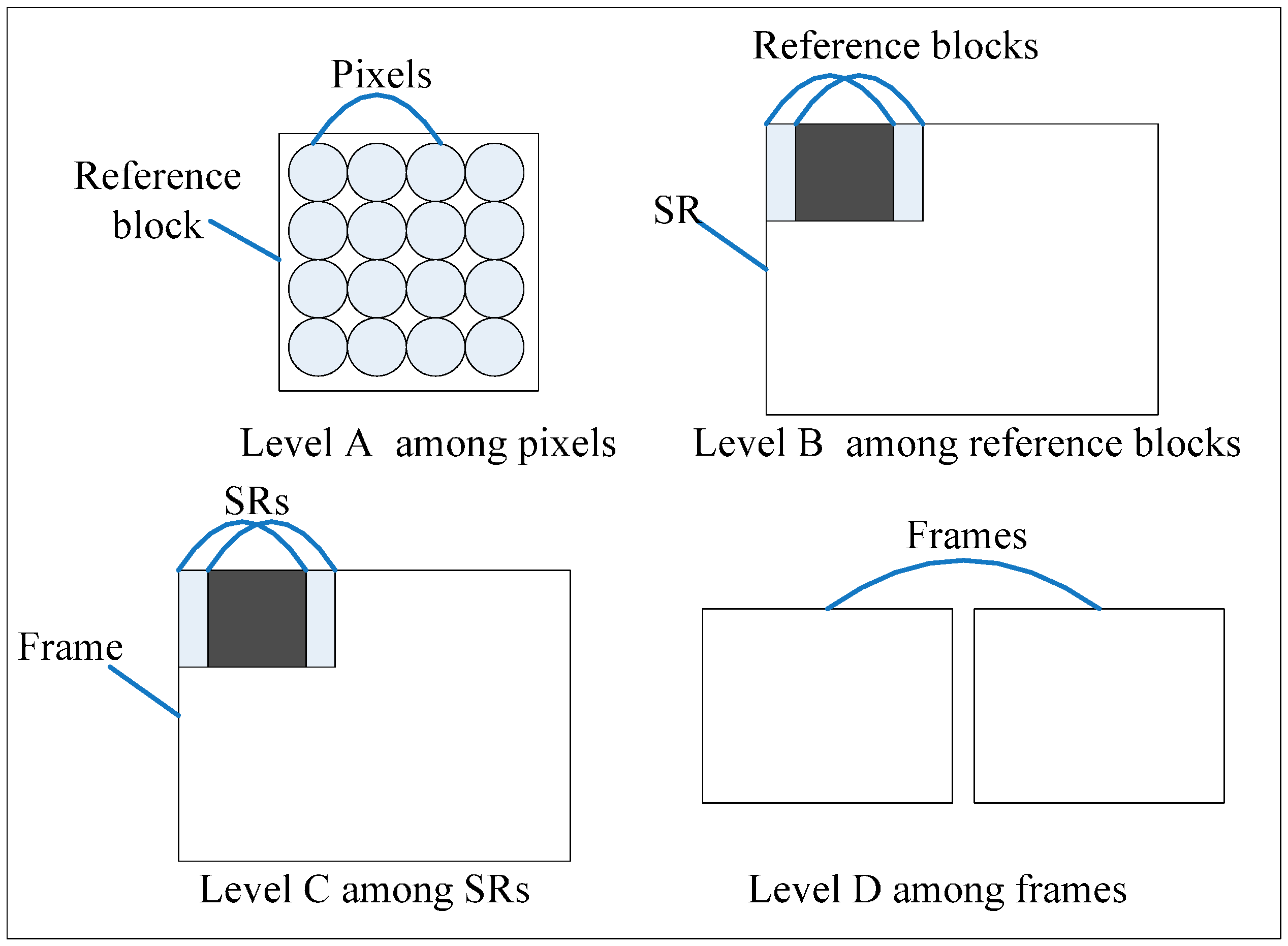 | Level B | among reference blocks | F × (W/N) × (H/N) × SRH × SRV |