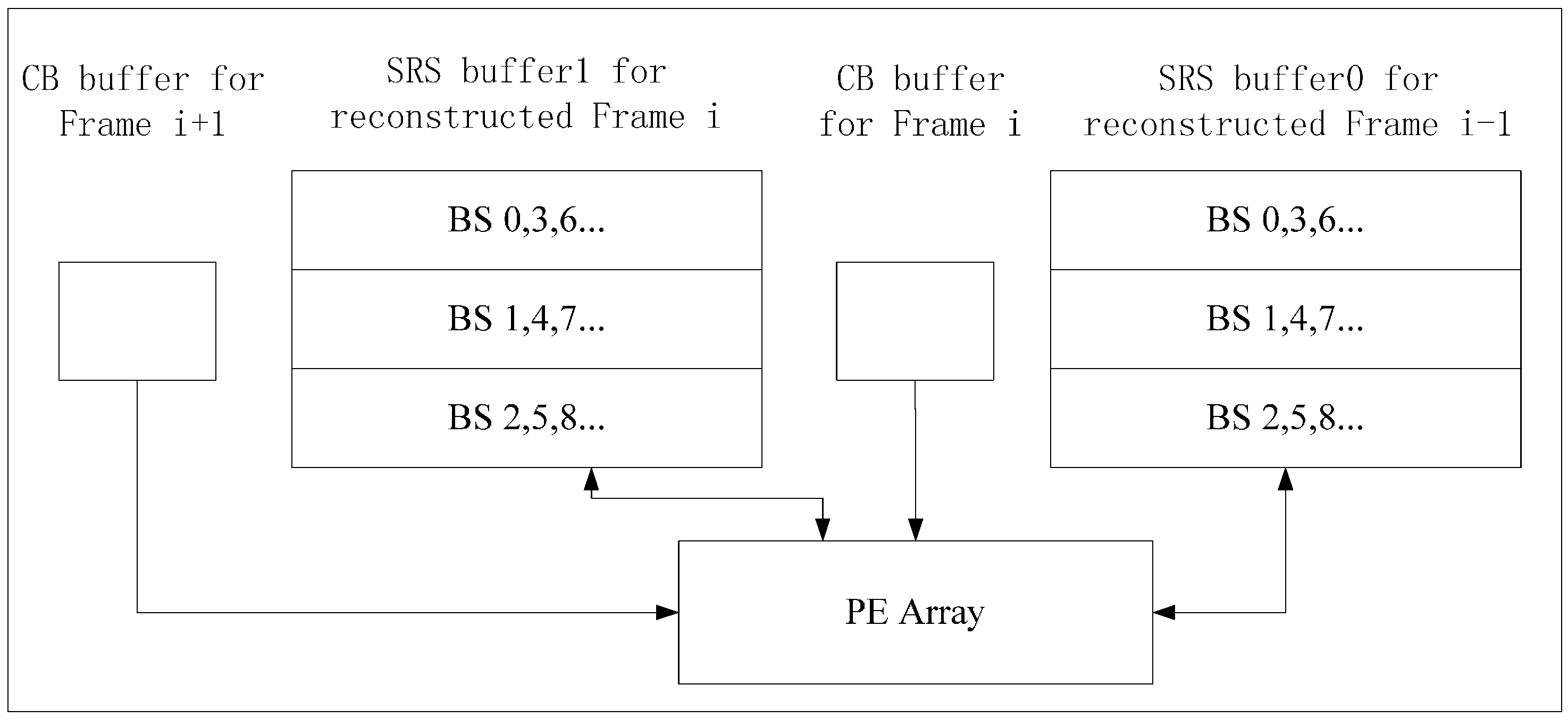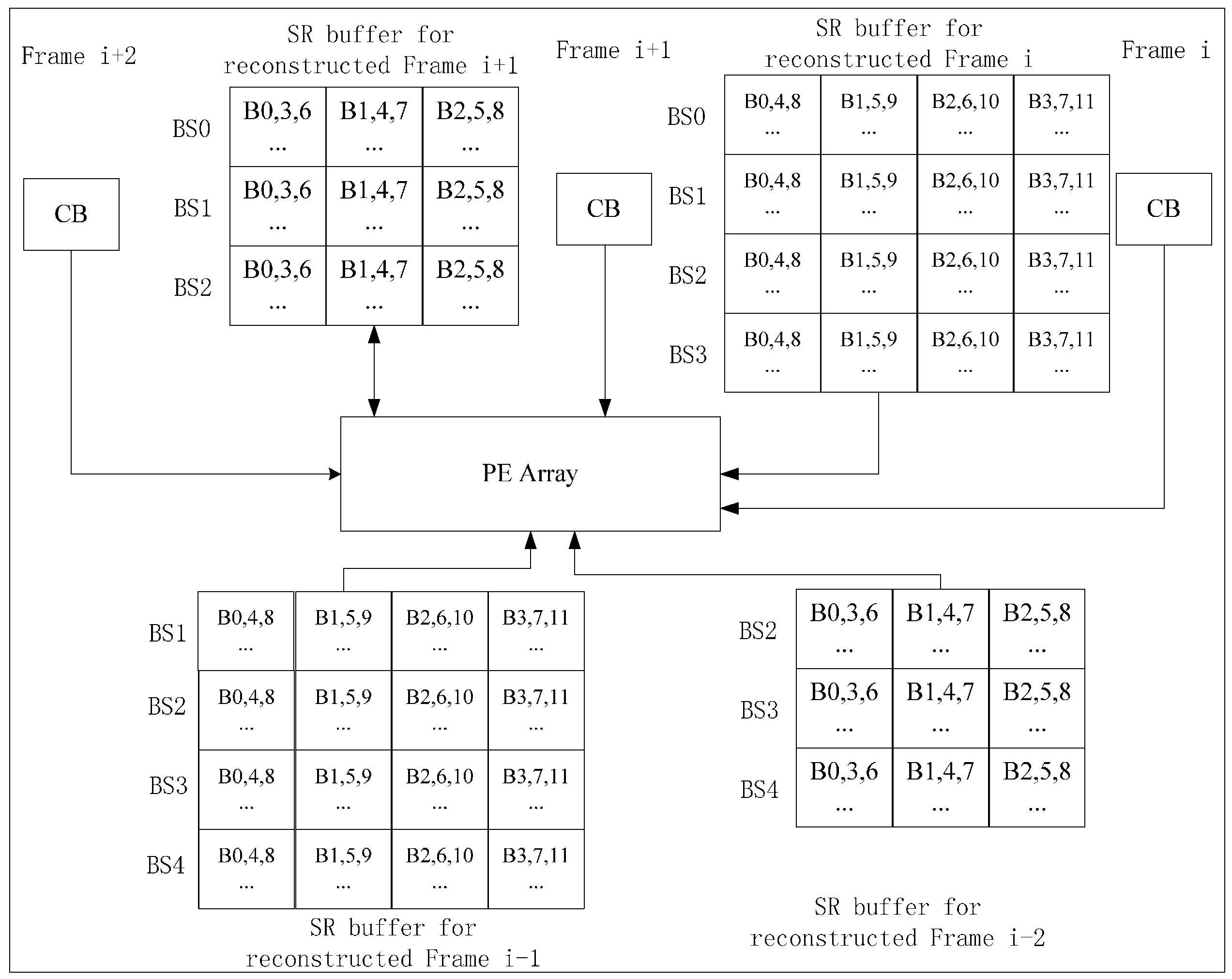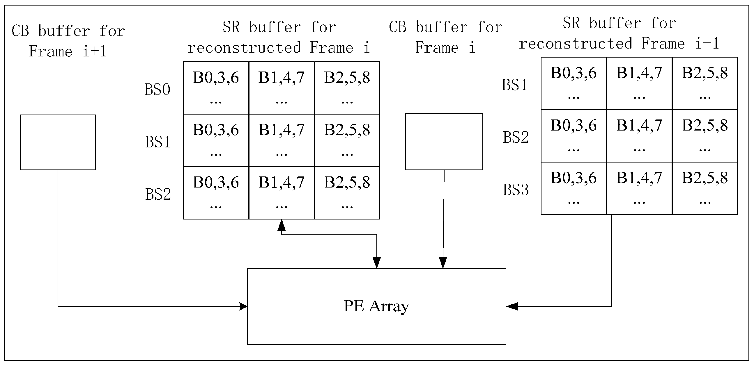 To make the reconstructed frame buffered on chip and used by the next current frame, we can use two frame buffers and one PEA to implement Inter-E for VC-SRME as in Figure 4 but two frame buffers are used to store two reconstructed frames. We can reduce the size of the frame buffer by reusing the buffer between two adjacent reconstructed frames. In Figure 5, the reconstructed frame buffer is divided into H/N + 2 BS buffers and designed as a circular buffer. We assume that SRv equals 2N for convenience, which means that one SRS includes three BSs. Frame i is the reconstructed previous frame and Frame i + 1 is the reconstructed current frame. When processing BS2 of current Frame i + 1, BS1, BS2, and BS3 of reconstructed Frame i is considered as the corresponding SRS. Thus, BS0 of reconstructed Frame i is useless and can be replaced by BS2 of reconstructed Frame i + 1 (Figure 6). In the same way, BS1 of reconstructed Frame i and BS3 of reconstructed Frame i + 1 share the same BS buffer. Thus, a BS buffer is shared by two adjacent reconstructed frames. Comparing Figure 5 with Figure 4, the size of frame buffer is reduced from 2 × W × H to W × H + 2 × N × W. As only current frames are loaded from off-chip memory and reference frames are cached on chip, Ra equals 1 for Inter-E of VC-SRME.