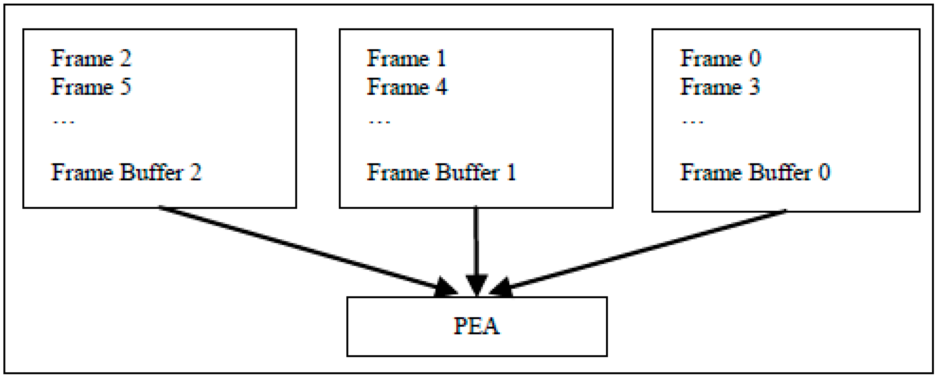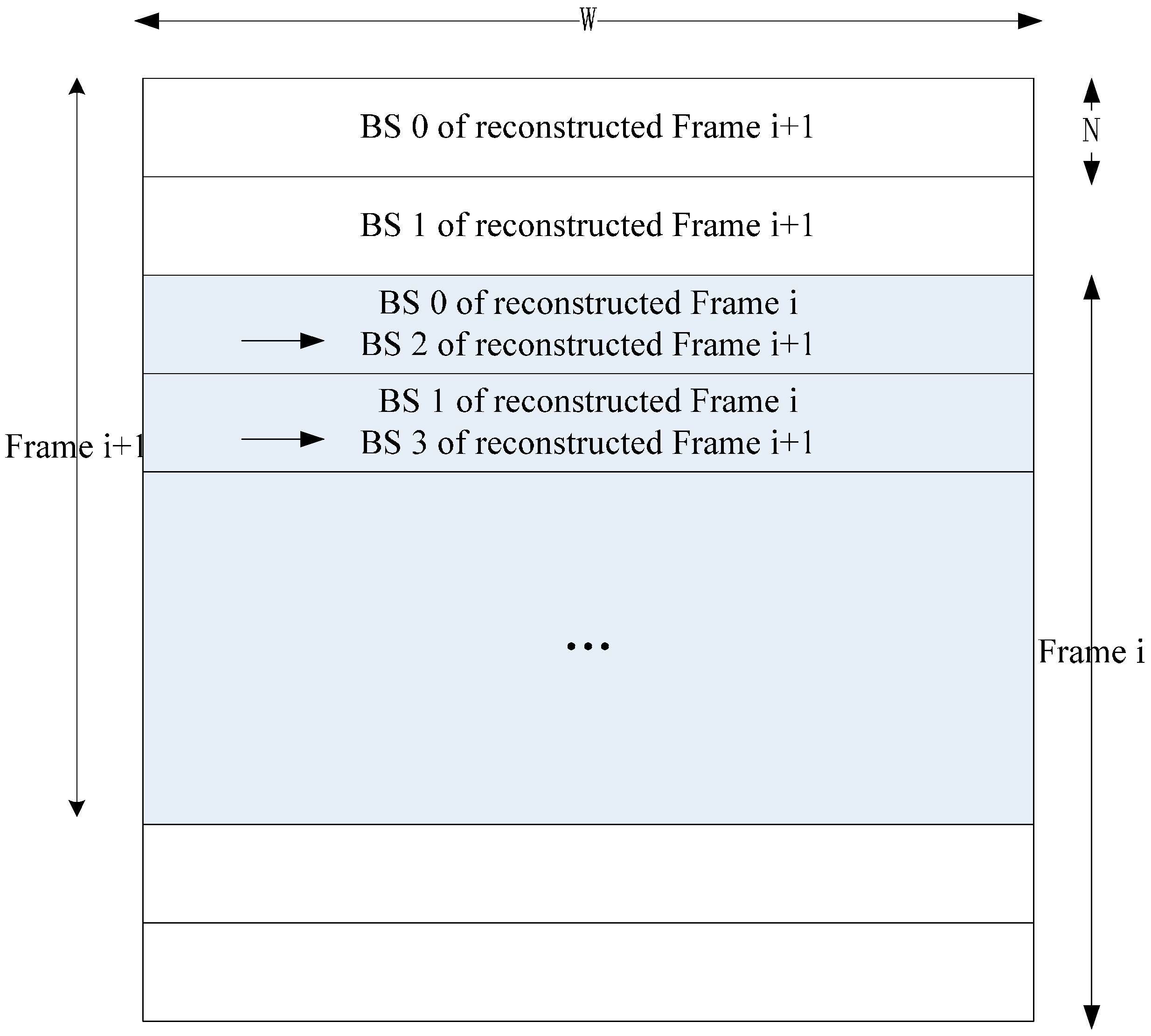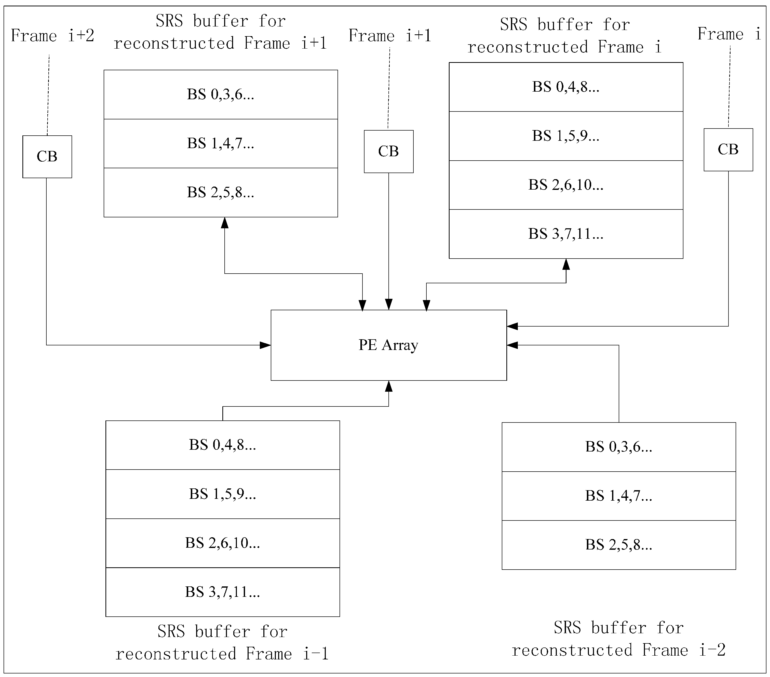 To make the reconstructed frame buffered on chip and used by the next current frame, we can use two frame buffers and one PEA to implement Inter-E for VC-SRME as in Figure 4 but two frame buffers are used to store two reconstructed frames. We can reduce the size of the frame buffer by reusing the buffer between two adjacent reconstructed frames. In Figure 5, the reconstructed frame buffer is divided into H/N + 2 BS buffers and designed as a circular buffer. We assume that SRv equals 2N for convenience, which means that one SRS includes three BSs. Frame i is the reconstructed previous frame and Frame i + 1 is the reconstructed current frame. When processing BS2 of current Frame i + 1, BS1, BS2, and BS3 of reconstructed Frame i is considered as the corresponding SRS. Thus, BS0 of reconstructed Frame i is useless and can be replaced by BS2 of reconstructed Frame i + 1 (Figure 6). In the same way, BS1 of reconstructed Frame i and BS3 of reconstructed Frame i + 1 share the same BS buffer. Thus, a BS buffer is shared by two adjacent reconstructed frames. Comparing Figure 5 with Figure 4, the size of frame buffer is reduced from 2 × W × H to W × H + 2 × N × W. As only current frames are loaded from off-chip memory and reference frames are cached on chip, Ra equals 1 for Inter-E of VC-SRME.
