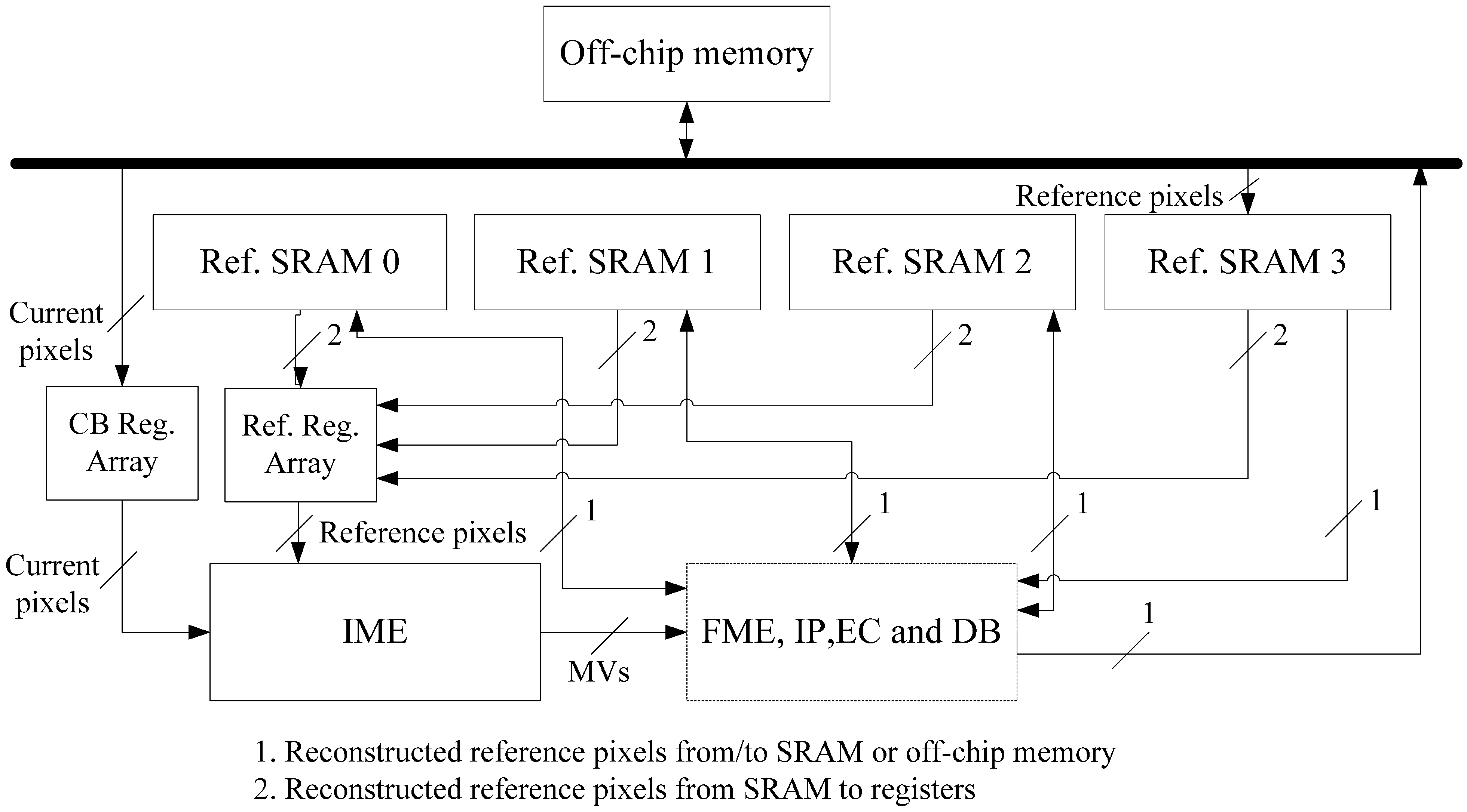 In recent years, the speed gap between on-chip computing and off-chip memory access has grown larger and larger, so it is important to reduce off-chip bandwidth requirement to improve overall performance especially for real-time video applications [19]. Reusing data on chip is usually considered to reduce off-chip memory traffic. Some data reuse methods are proposed for FSIME [20,21,22,23,24]. Previous work mainly focused on intra-frame data reuse within a reference frame but inter-frame data reuse was neglected. For VC-ME, the reconstructed frame was usually stored to off-chip memory and then loaded to on-chip memory when needed [23,25,26,27,28]. If the reconstructed frame is reused on chip without being stored to off-chip memory for VC-ME, the off-chip memory traffic will be greatly reduced.