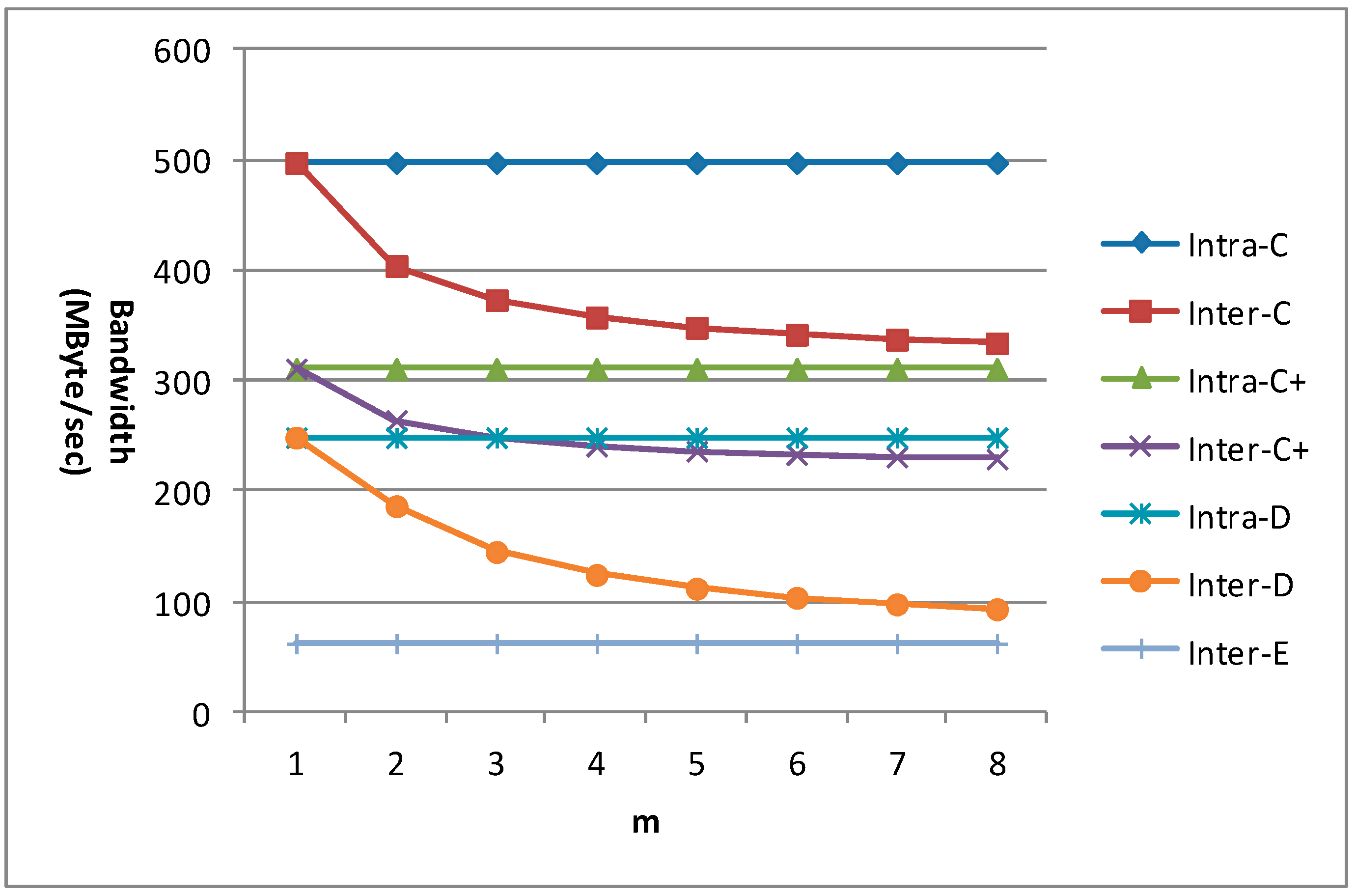 m is an important factor which affects the data reuse efficiency for the new inter-frame data reuse scheme. So the bandwidth requirement for 1080 p with different m is given in Figure 21 for different data reuse levels of VC-SRME. n equals 4 in the C+ scheme. We can find that the bandwidth requirements of all the intra-frame data reuse levels (including Intra-A and Intra-B which are not shown in the figure) and Inter-E are unchanged with the variation of m. When m equals 1, the bandwidth requirement of the inter-frame data reuse level is the same as that of its corresponding intra-frame data reuse level. The bandwidth requirements of Inter-C, Inter-C+, and Inter-D become lower with the increase of m, but the bandwidth reduction magnitude becomes smaller because there is always a constant which will not change with m in the formula of Ra. We find that the bandwidth requirement reduction for Inter-D is more effective than that for Inter-C or Inter-C+ because Inter-D can reuse the reconstructed frame more efficiently.
