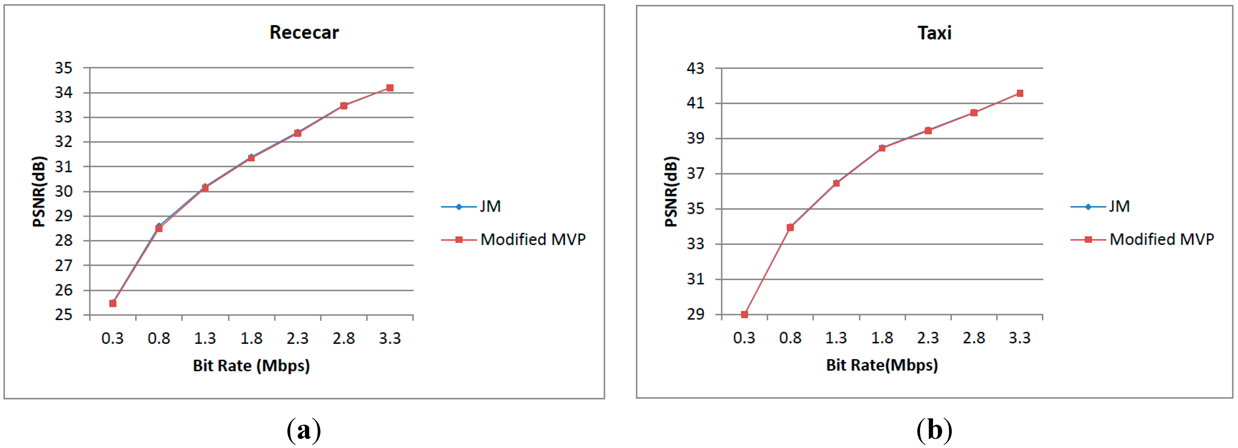 Comparison of RD curves between JM and modified motion vector prediction. (a) The comparison between JM and modified motion vector prediction in Racecar; (b) The comparison between JM and modified motion vector prediction in Taxi.