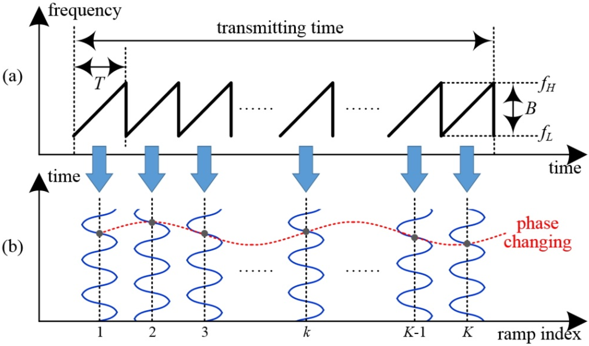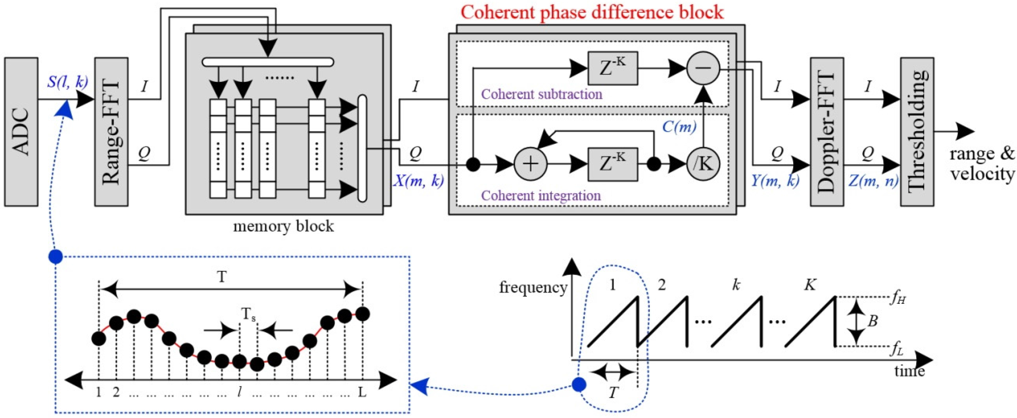 In the fast-ramp based FMCW radar, the received beat signal is digitalized into by ADC (Analog Digital Converter) with sampling frequency . Here, L is the sample size in one ramp, and K is the number of ramps.