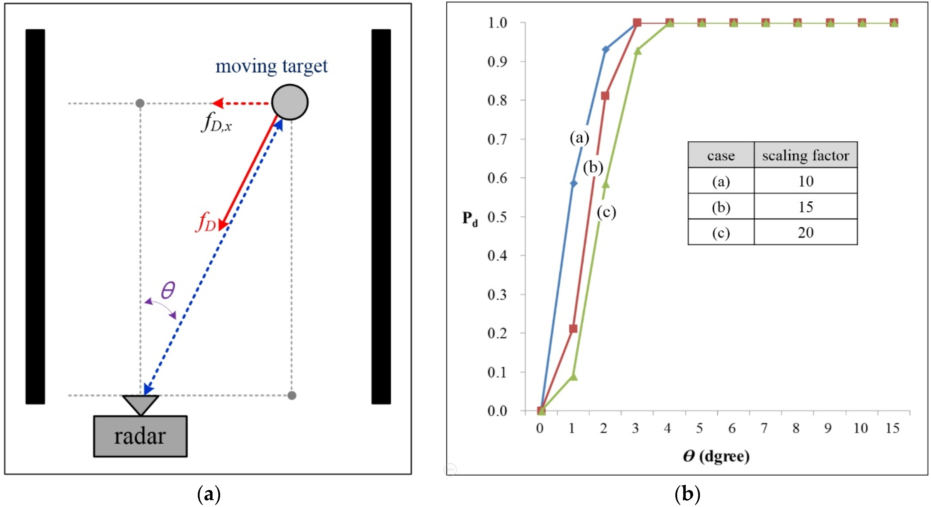 The detection probability of a moving target when varying the scaling factor for the angular position: (a) scenario considered for the worst case; and (b) simulation results.