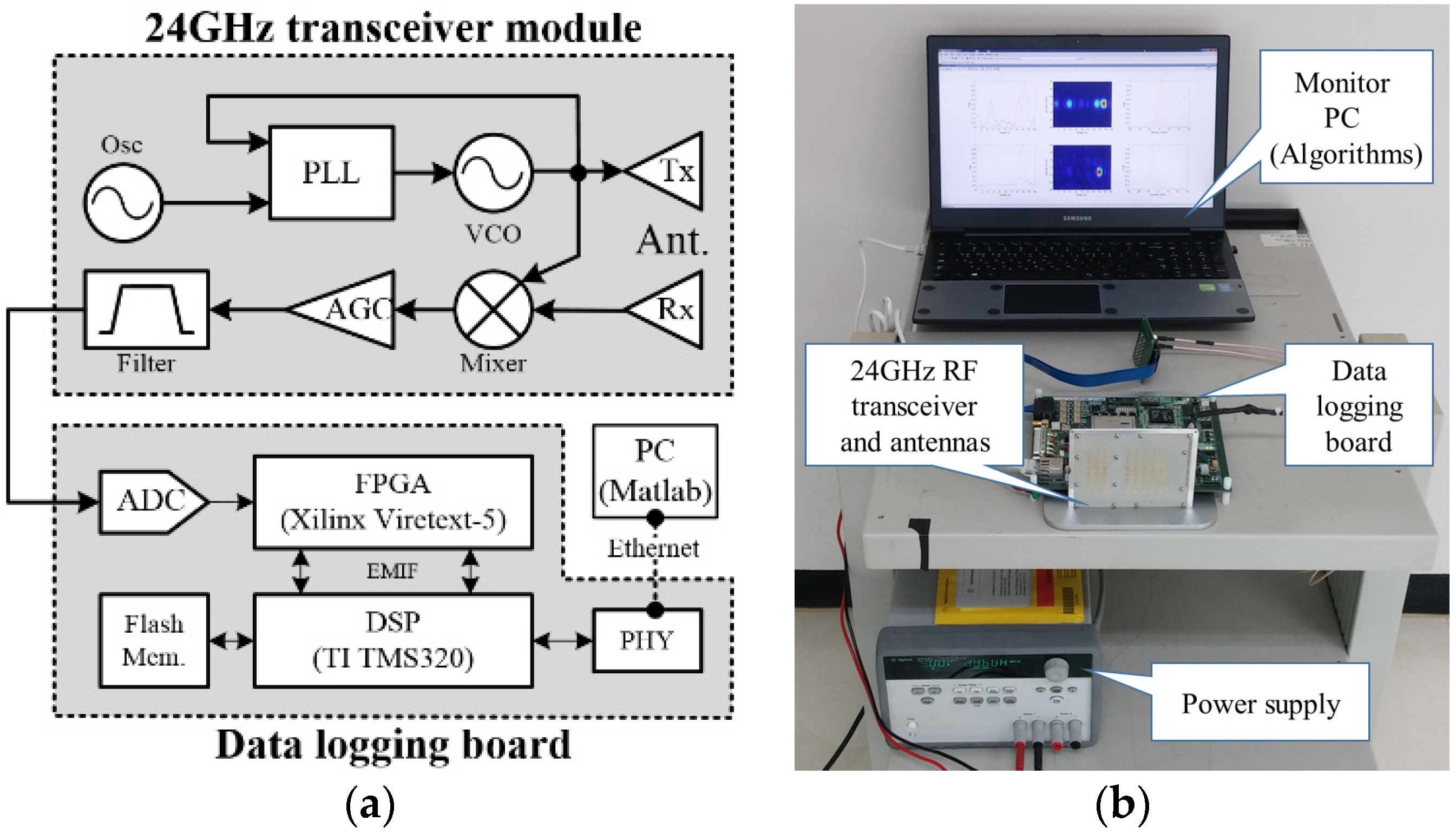 Measurement set-up using real time logging system together with 24 GHz FMCW transceiver: (a) block diagram of the developed radar test bed; and (b) photo of measurement set-up.
