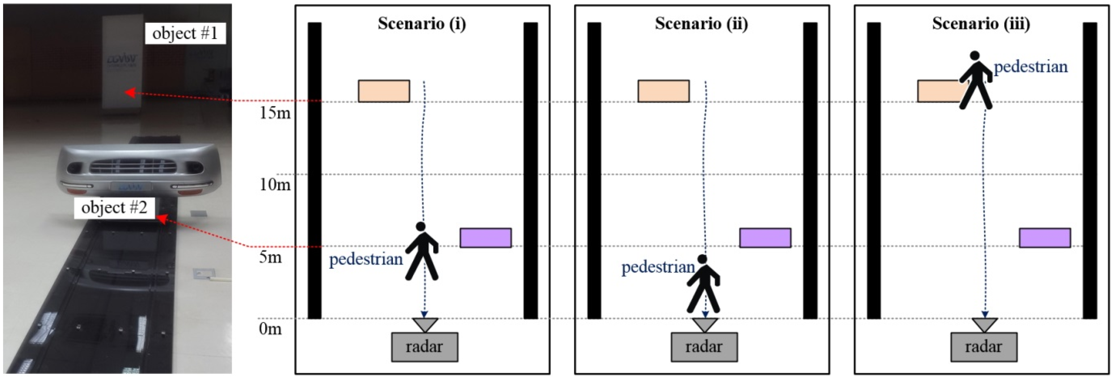 We measured the performance of the newly designed pedestrian detection scheme in the laboratory under clutter environments comprising three scenarios. Figure 7 shows the configuration of measurement scenarios for laboratory tests. Two stationary objects with strong signals were located 5 m and 15 m from radar sensor, to provide unwanted clutter. There is a moving human with weak Radar Cross-Section (RCS) within the 1–20 m range.