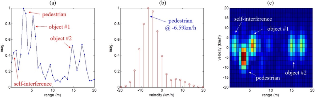 Moreover, in Figure 9e,f, even if the zero Doppler components were removed in each range, pedestrian hidden by main-lobes of self-interference could not be easily distinguished in the Doppler frequency domain.