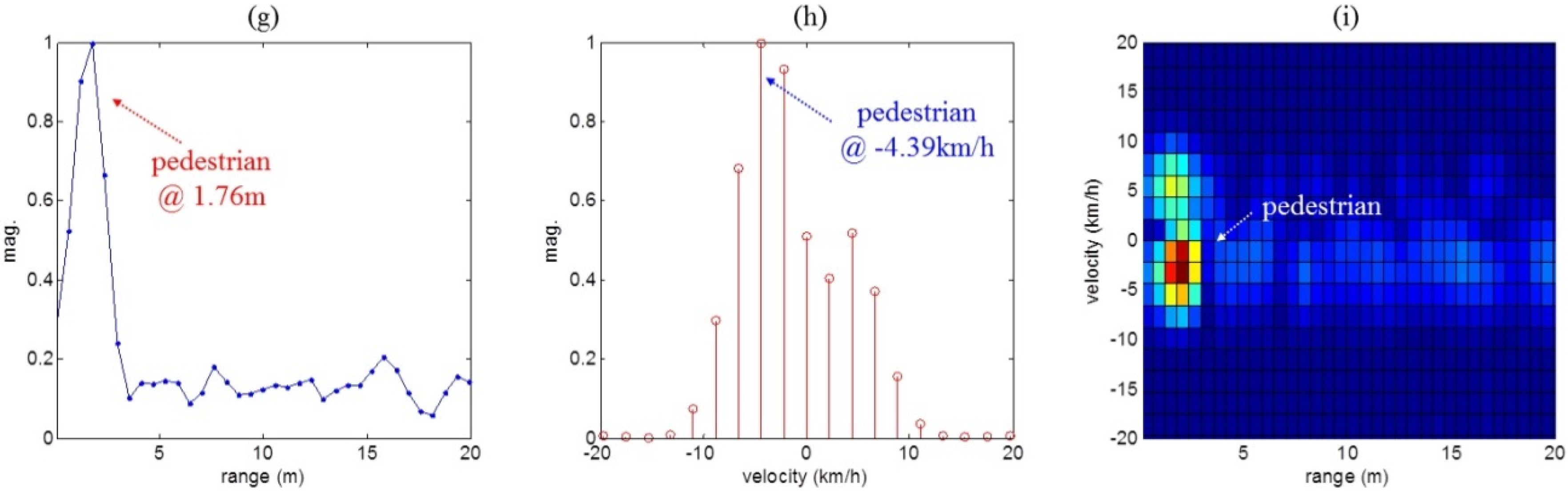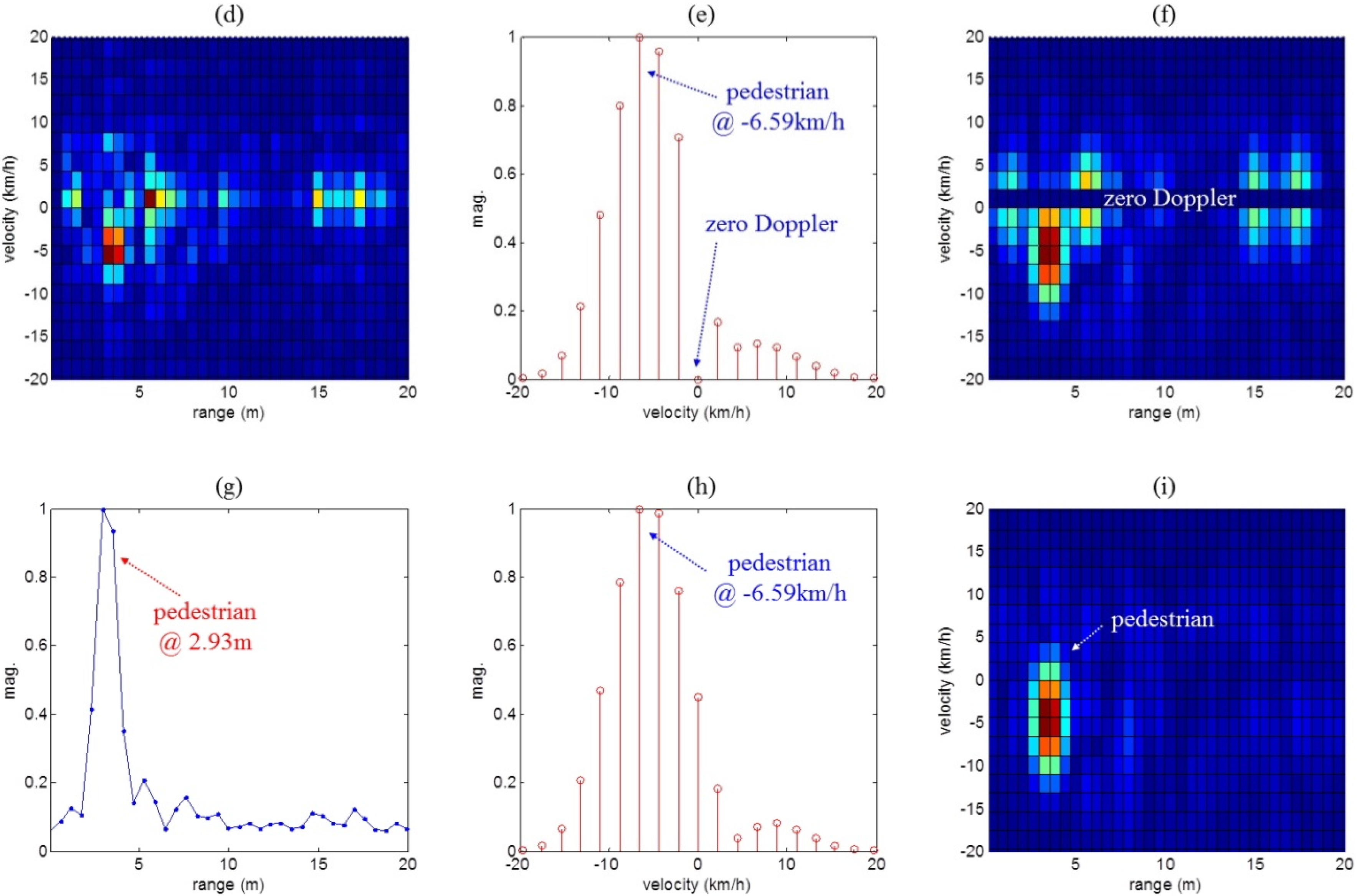 Figure 8a,g, Figure 9a,g and Figure 10a,g show range profiles, where the x-axis indicates range (meter) and the y-axis is the normalized magnitude. In Figure 8b,e,h, Figure 9b,e,h and Figure 10b,e,h, we can see Doppler frequency spectra in the specific range occupied by the moving human. Here, the x-axis and the y-axis indicate velocity (km/h) and normalized magnitude. Finally, 2D range-Doppler maps are presented in Figure 8c,d,f,i, Figure 9c,d,f,i and Figure 10c,d,f,i where the x-axis indicates range (meters) and y-axis is velocity (km/h).