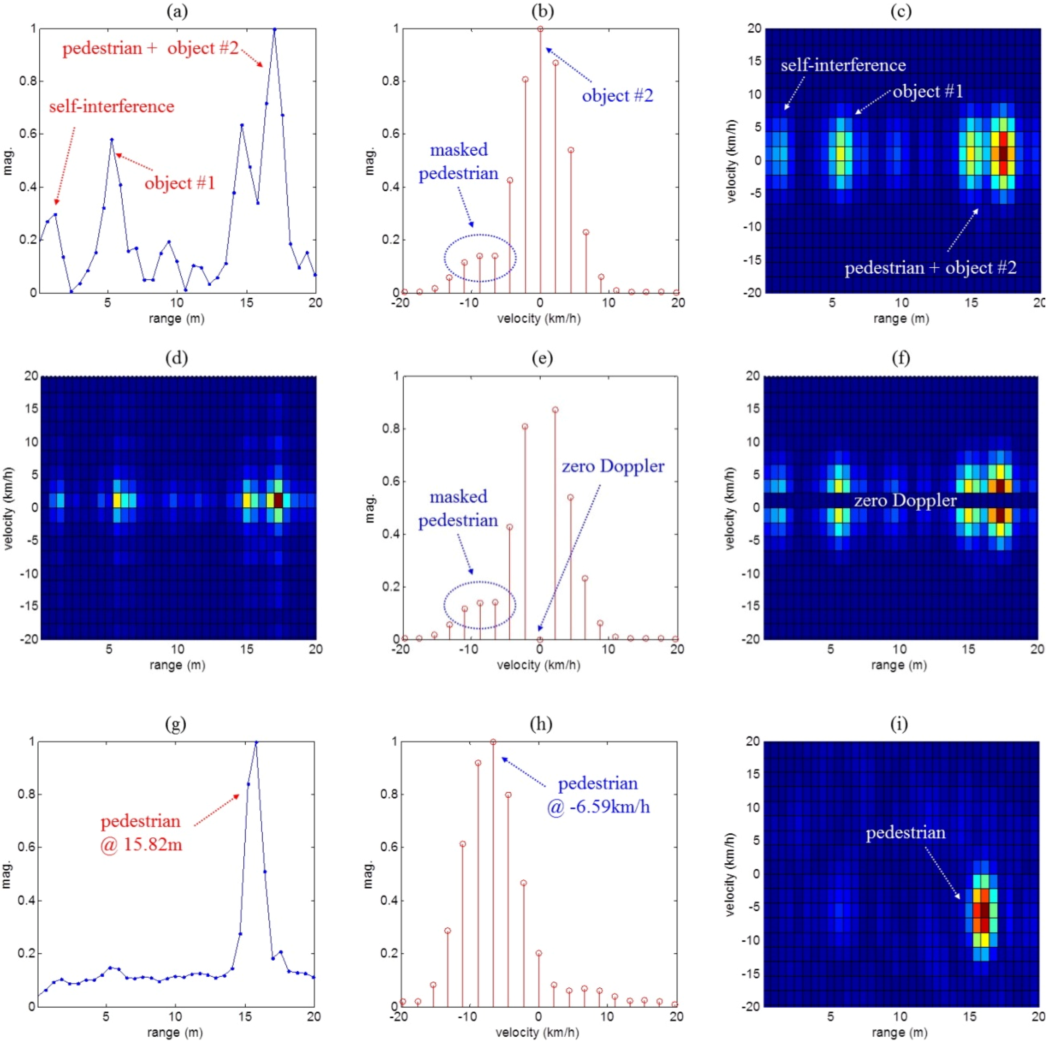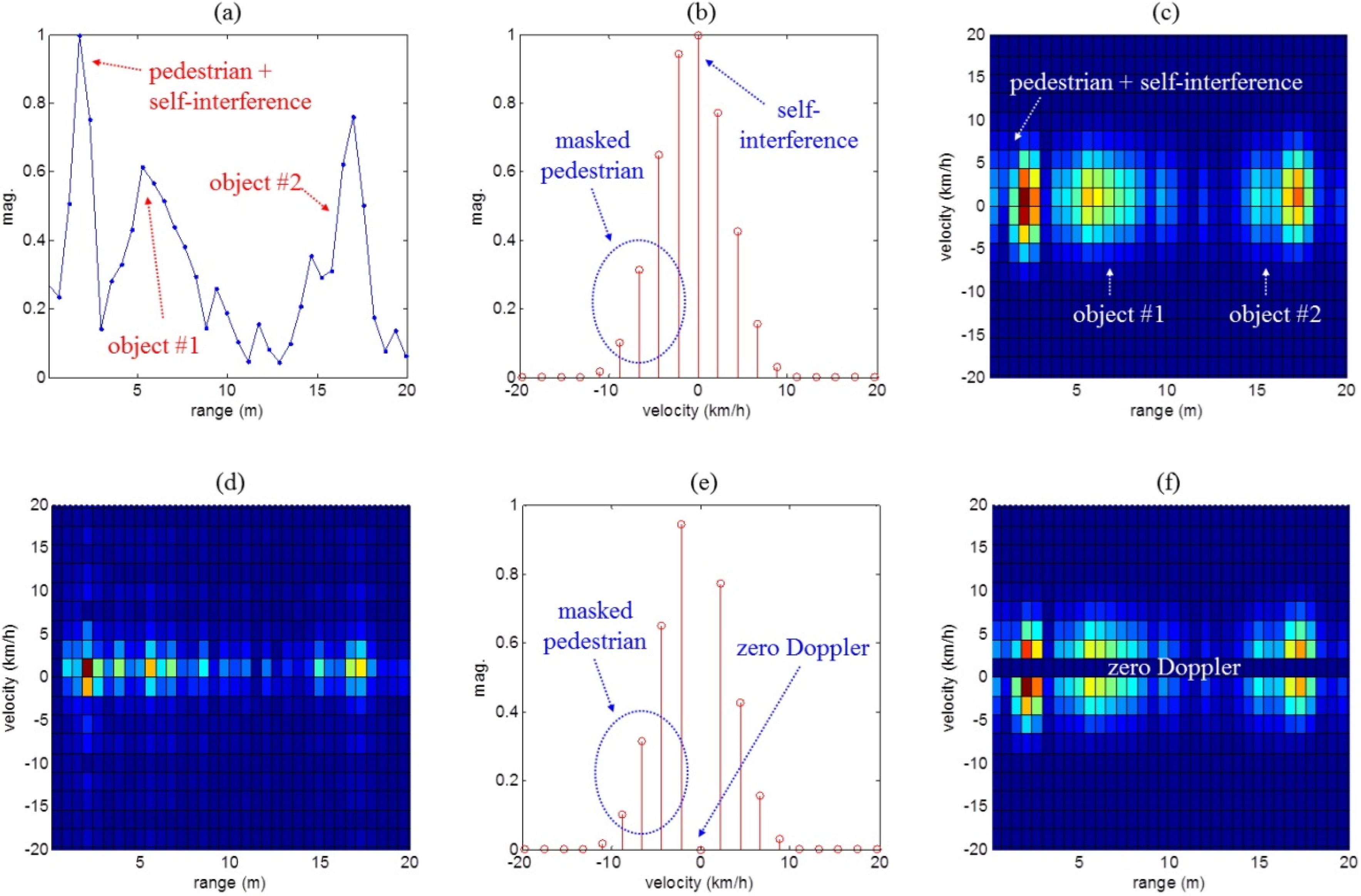 However, if the clutter has a very strong signal, a moving pedestrian with weak reflectivity and weak Doppler return might be masked by the strong echoes, even though echoes and human target were noticeably separated in the Doppler dimension. Here, we considered self-interference and reflections from stationary targets as clutter.