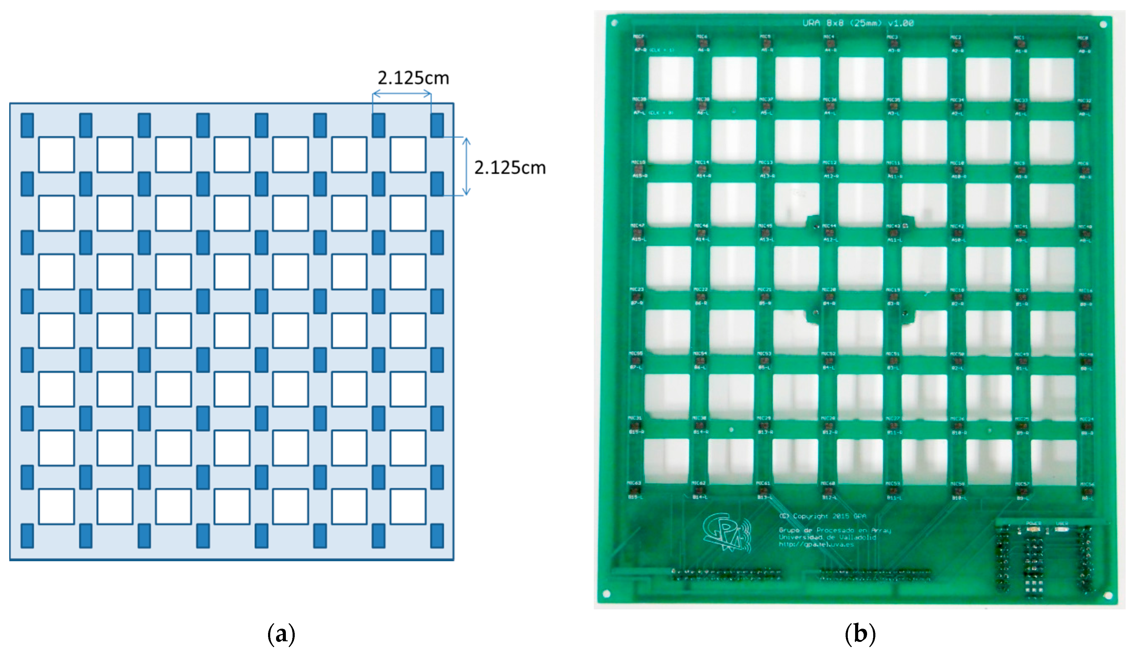 The acoustic images acquisition system shown in this paper is based on a Uniform Planar Array (UPA) of MEMS microphones. This array, which has been entirely developed by the authors, is a square array of 64 (8 × 8) MEMS microphones that are spaced uniformly, every 2.125 cm, in a rectangular Printed Circuit Board (PCB), as shown in Figure 1. As can also be observed in Figure 1, the PCB where the MEMS microphones are placed has square gaps between the acoustic sensors, in order to make the array as light and portable as possible.