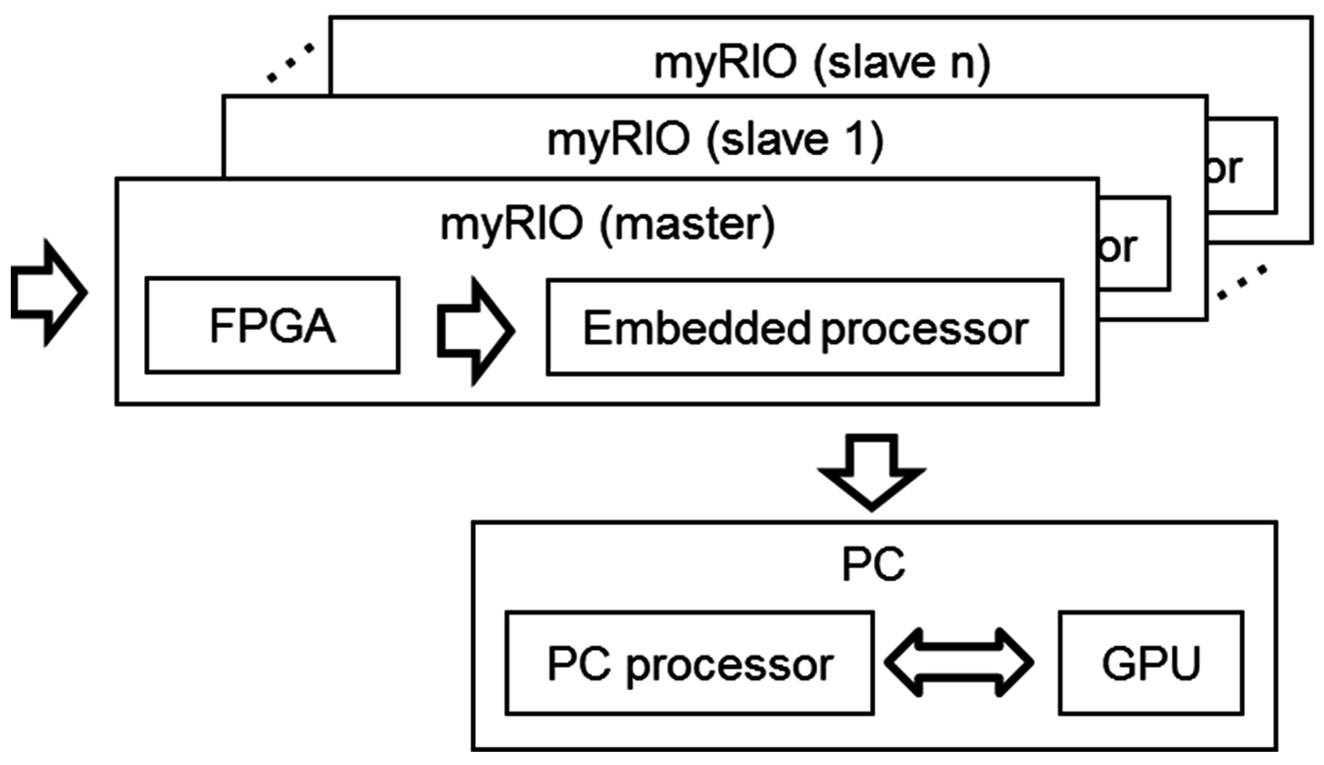 - As a control unit, a single PC can manage several myRIO platforms, each one associated to an array module. This feature allows clustering several modules for a proper operation of the system, which are synchronized between them using their I/O lines, where one myRIO is the master and the others are slaves.