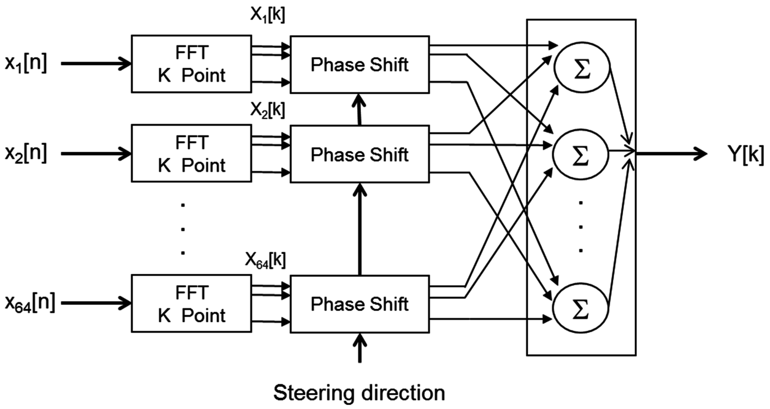 Finally, in the image generation block, based on wideband beamforming, a set of N × N steering directions are defined, and the beam former output are assessed for each of these steering directions. Wideband beamforming [3] computes the FFT of the MEMS signals xi[n]; multiplies, element by element, each FFT Xi[k] by a phase vector, that depends on the steering direction and the sensor position; and finally takes the sum of the FFT shifted in phase, as shown in Figure 5. The images generated are then displayed and stored in the system.