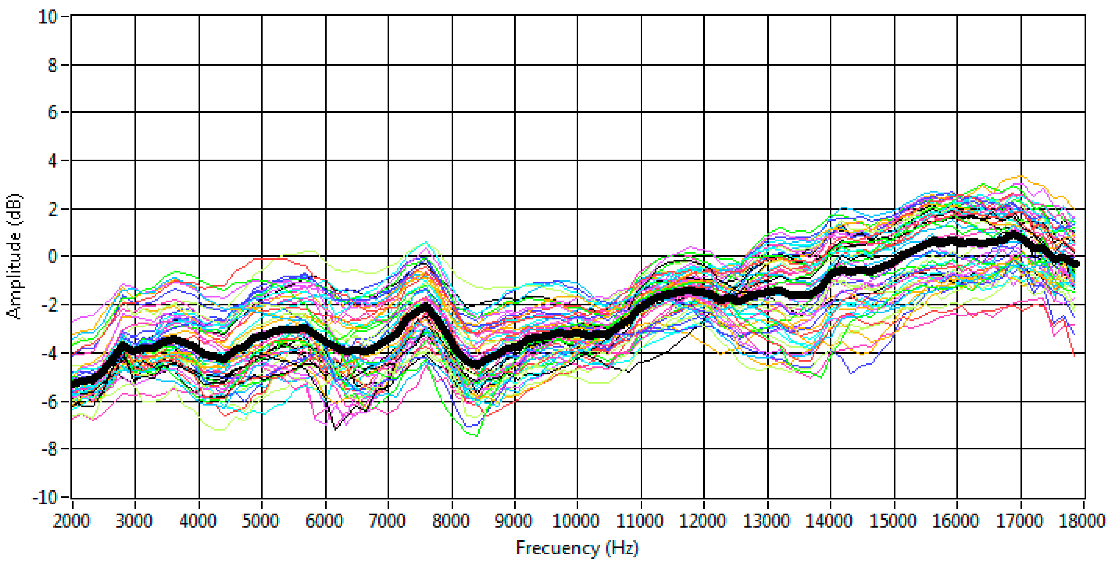 The frequency response of each MEMS sensor was obtained and normalized according to the loudspeaker’s response. Then, the average of the frequency responses was assessed. Figure 6 shows all the responses. It can be observed that the averaged frequency response is essentially flat, with a slight increase at high frequencies. This averaged response is bounded within a range of ±3 dB. Figure 7 also shows that the frequency response of MEMS sensors varies in a range of ±2 dB around the averaged value.