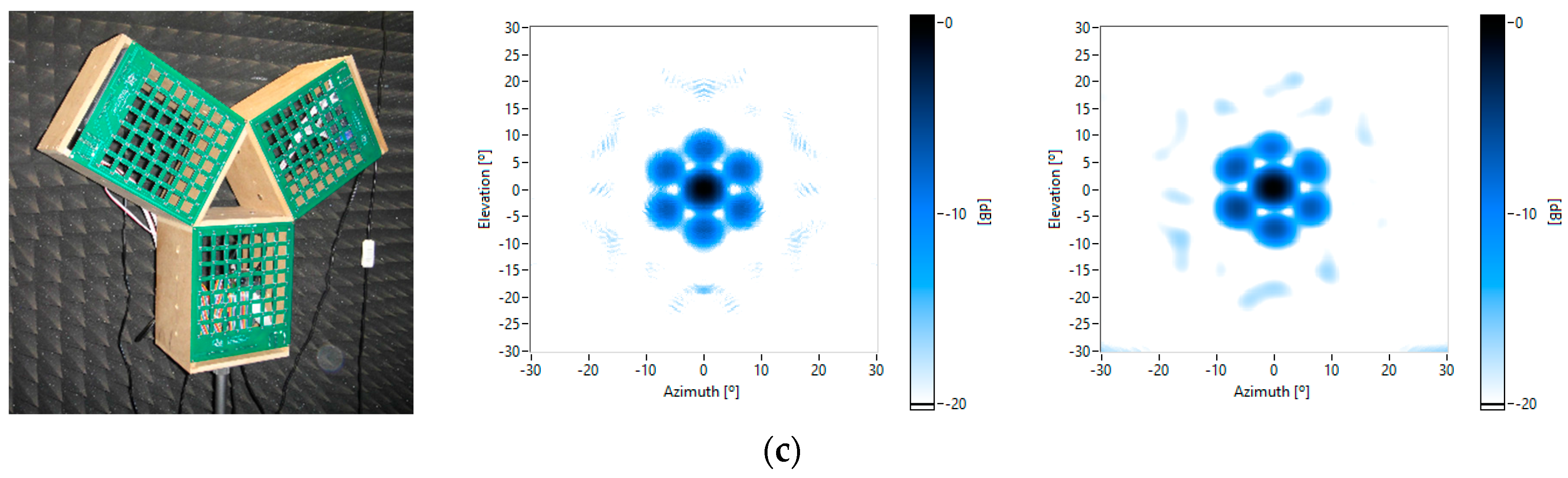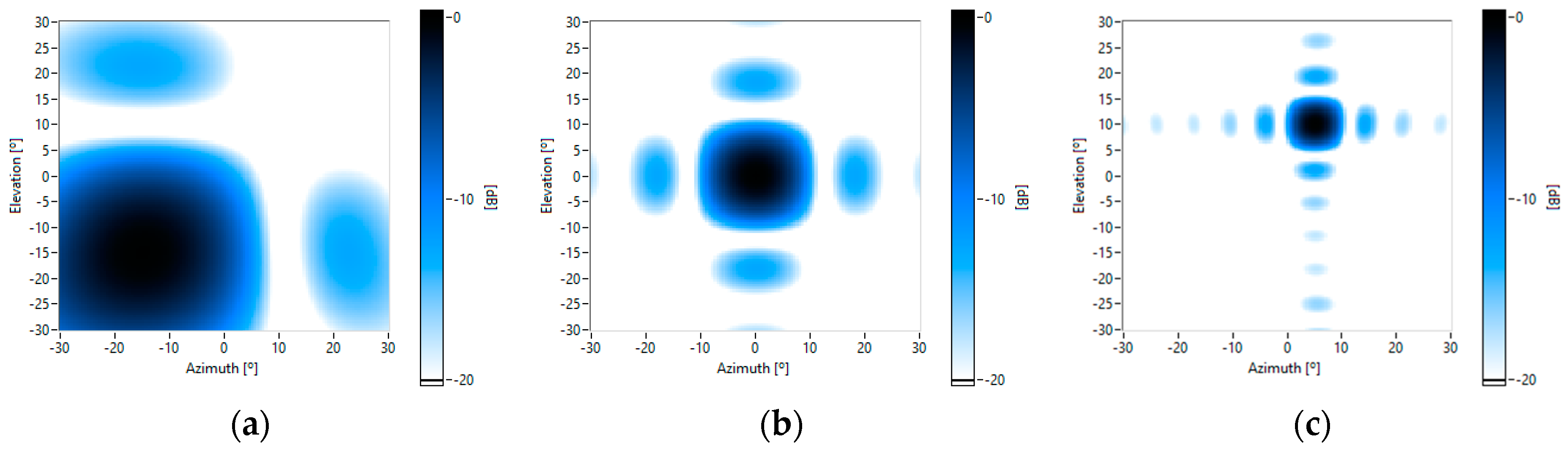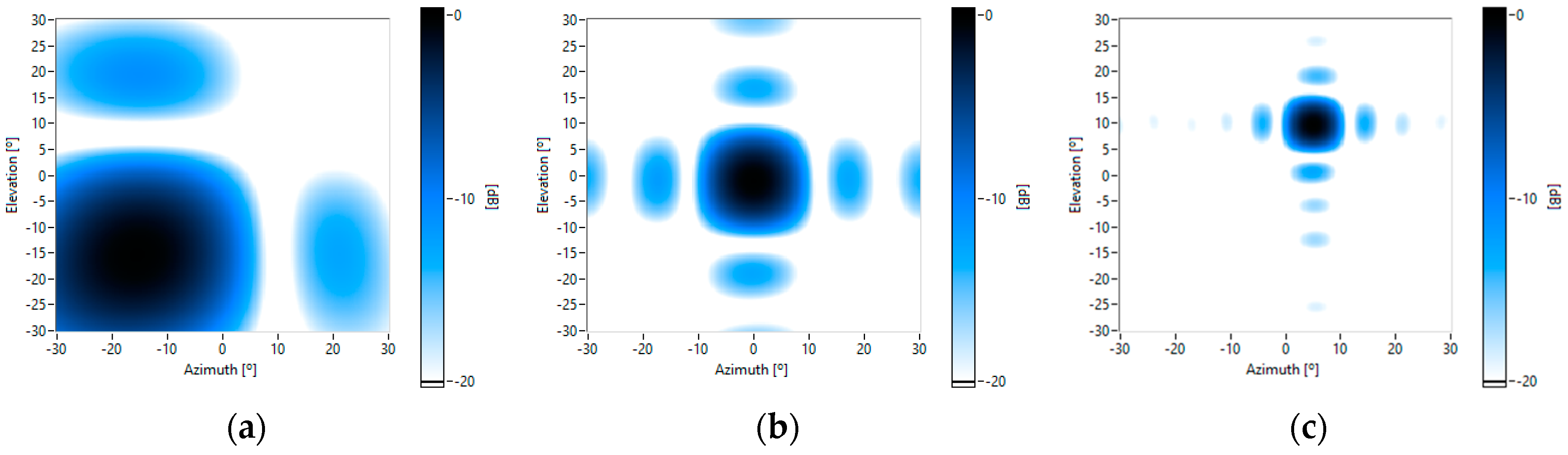 Theoretical beam patterns for different frequencies and pointing to different steering angles [azimuth, elevation]: (a) 4 kHz [−15°, −15°]; (b) 8 kHz and [0°, 0°]; and (c) 16 kHz and [5°, 10°].