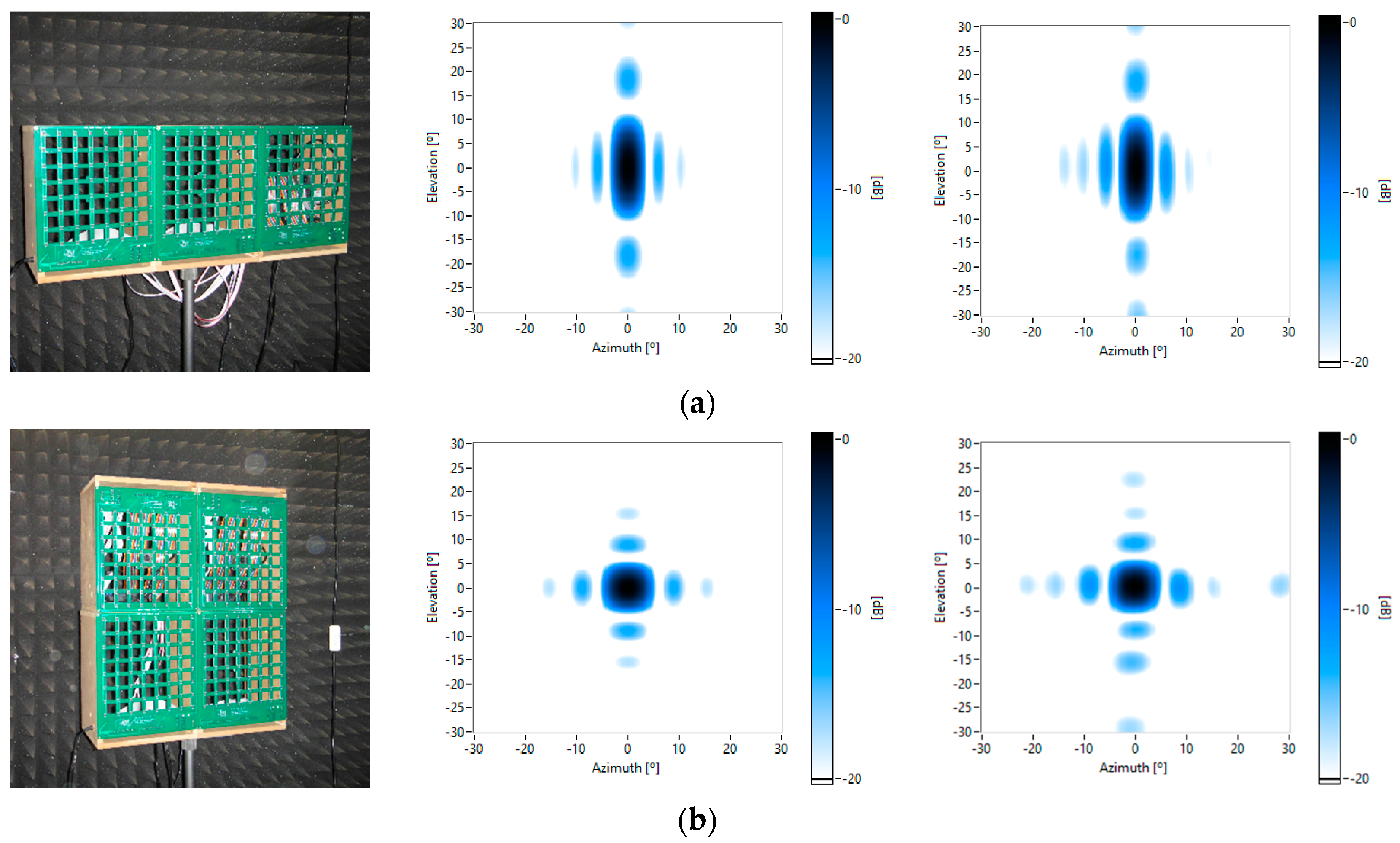 The row cluster shows that the beamwidth in azimuth has been reduced by a factor of 3, increasing the angular resolution of the image in that direction. In the square cluster, the beamwidth in azimuth and elevation is halved. Finally, in the star cluster, a radial symmetrical pattern is achieved with a similar beamwidth in multiple directions.
