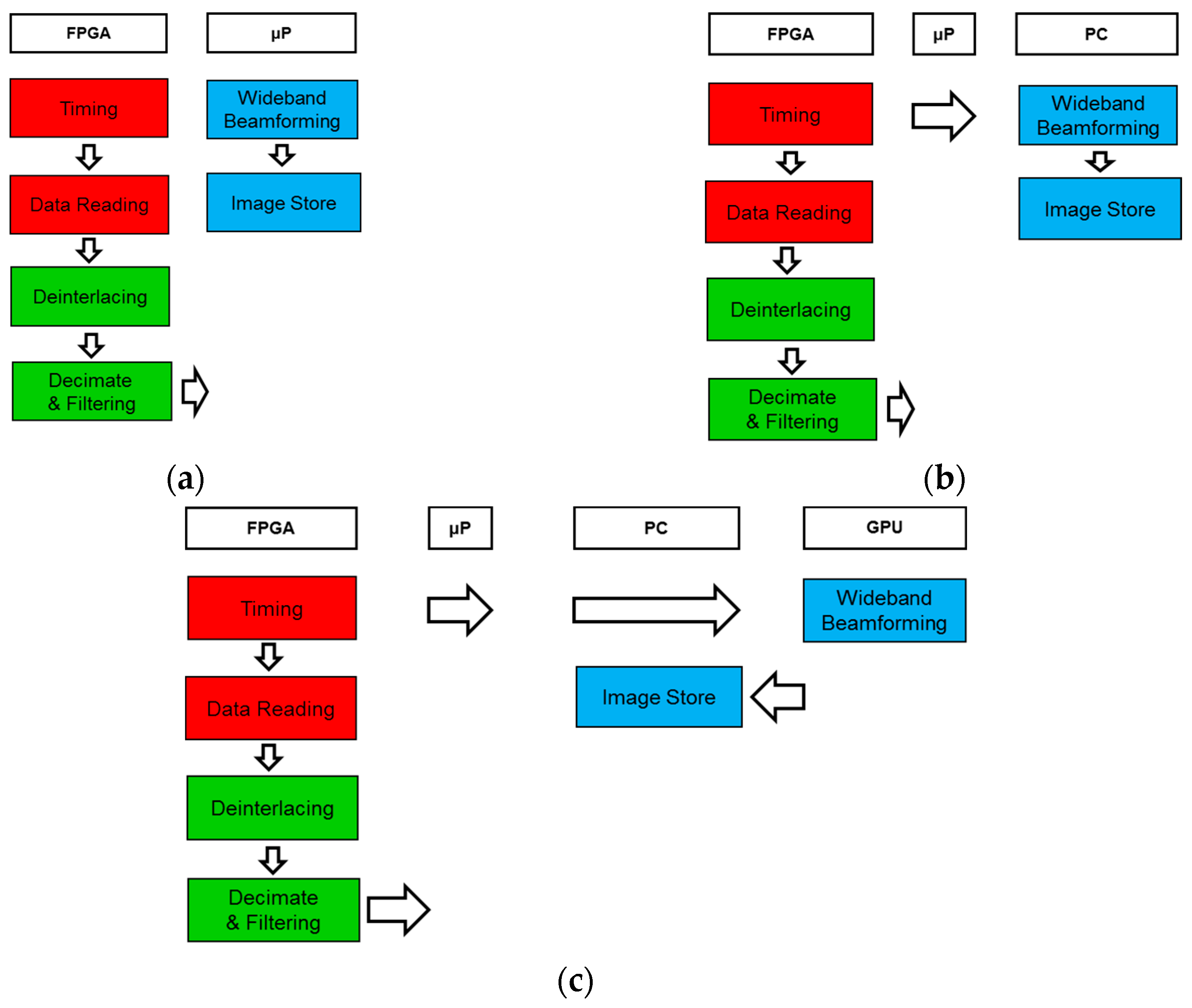 Figure 12. Embedded system (a); PC system (b); and PC system with GPU framework (c). - (2)