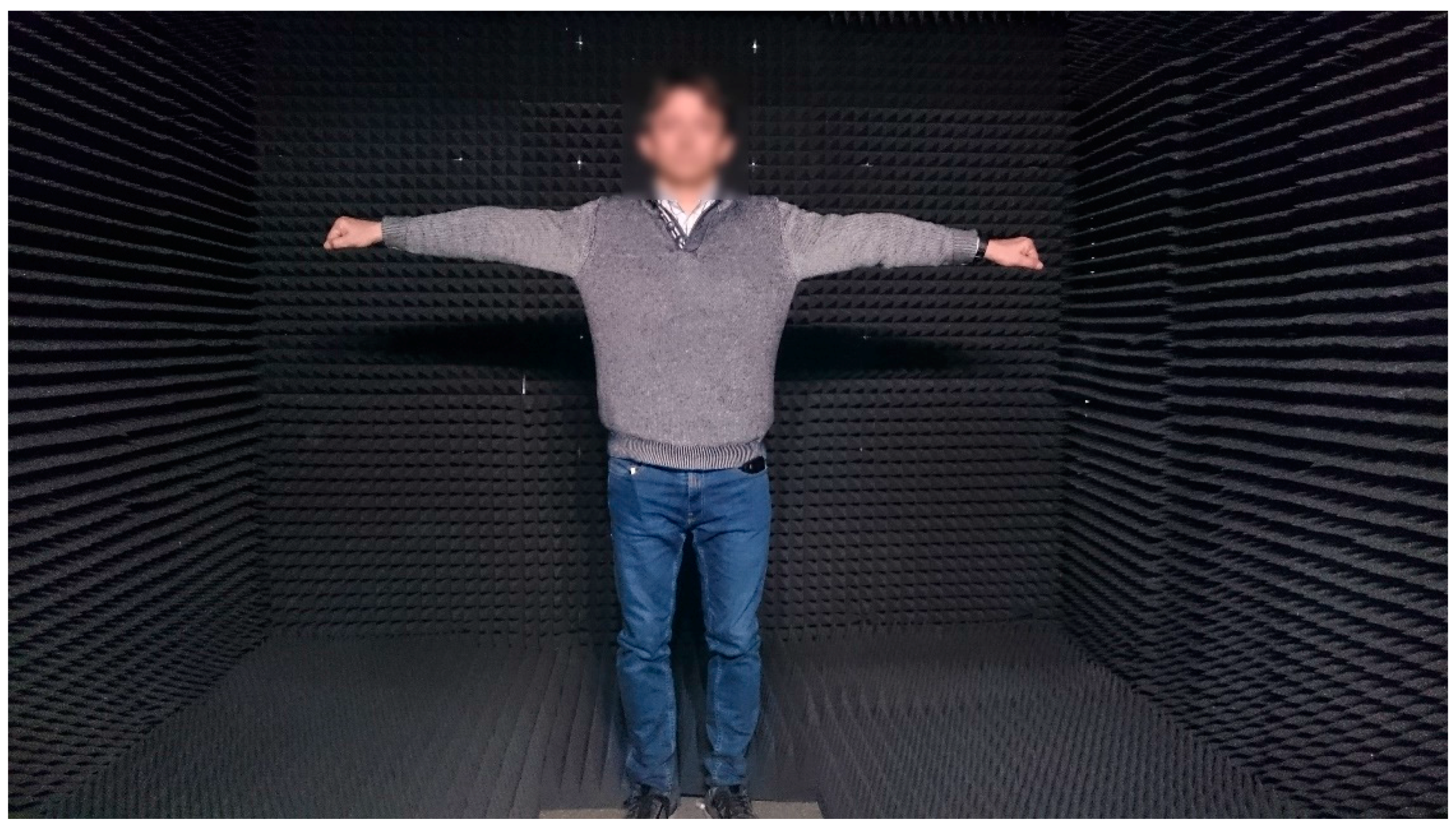 The biometric identification system is based on placing the person in front of the array and sending a multifrequency signal that is reflected on the person to be identified. The person and the system are placed inside an anechoic chamber in order to simplify the processing, but the chamber could be avoided if clutter removal techniques are used. The reflected signal is captured by the microphone array, obtaining several acoustic images for different ranges. The acoustic images are pre-processed to extract the information needed for further biometric identification. Figure 13 shows the image of a person under testing.