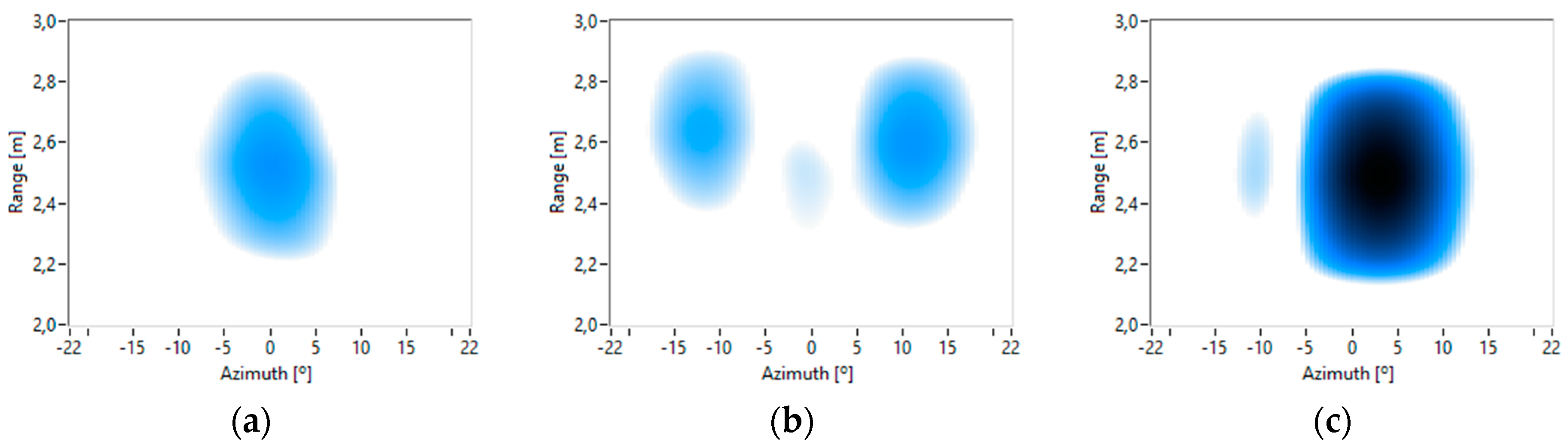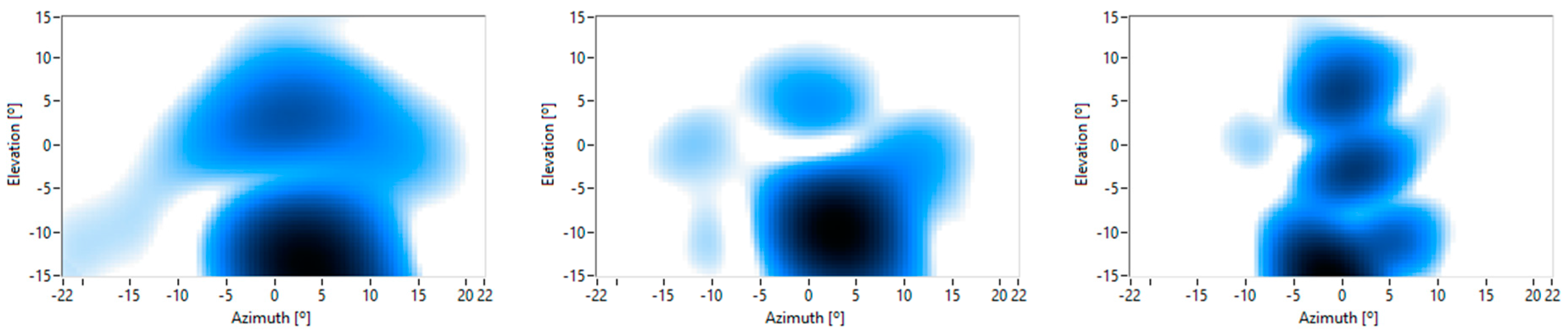 The range information can also be obtained from the captured images. Figure 15 shows images for a constant frequency and an elevation of 5°, 0° and −10°, with 0.5 m range intervals and a ±22° azimuth. Figure 15b shows that the torso is closer to the MEMS array than the arms. These results show that the designed system allows for the acquisition of 3D acoustic images.