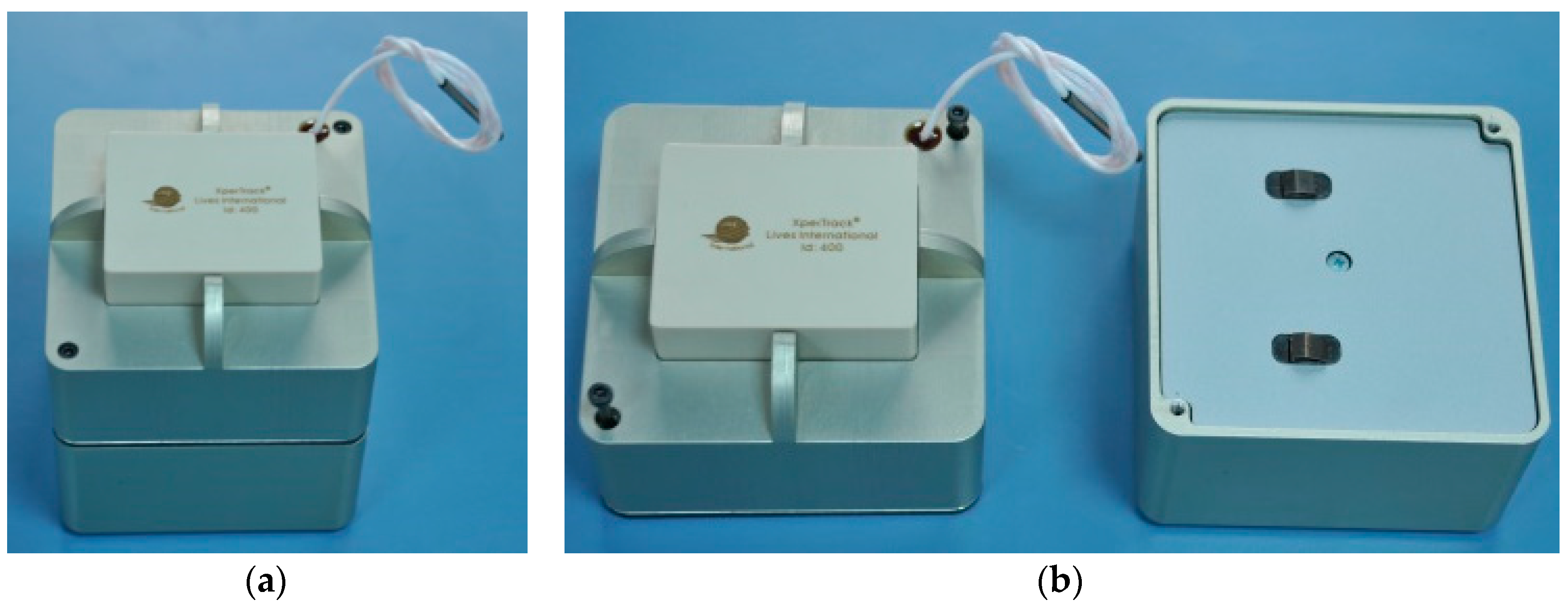 Comparing to other products on the market used in package tracking [10,11,12,13,14], the device is designed for harsh conditions (temperature range −30 °C to +80 °C) and a larger autonomy [10,11,12], (1 h reporting lasts up to 60 days). XpertTrack was designed to work below freezing point and for long periods of time, having a higher weight (i.e., 850 g because of the large battery) than other devices. The important advantage is the high accuracy temperature measurement (±0.1 °C accuracy and ±0.01 °C sensitivity), which is usually found in high accuracy temperature data loggers or reference probes. The probe sensor can go over the device temperature range, supporting cryogenic temperatures (−200 °C) and very high temperatures (+200 °C) and it is connected through a flexible cable of 480 mm (customizable to 1000 mm).