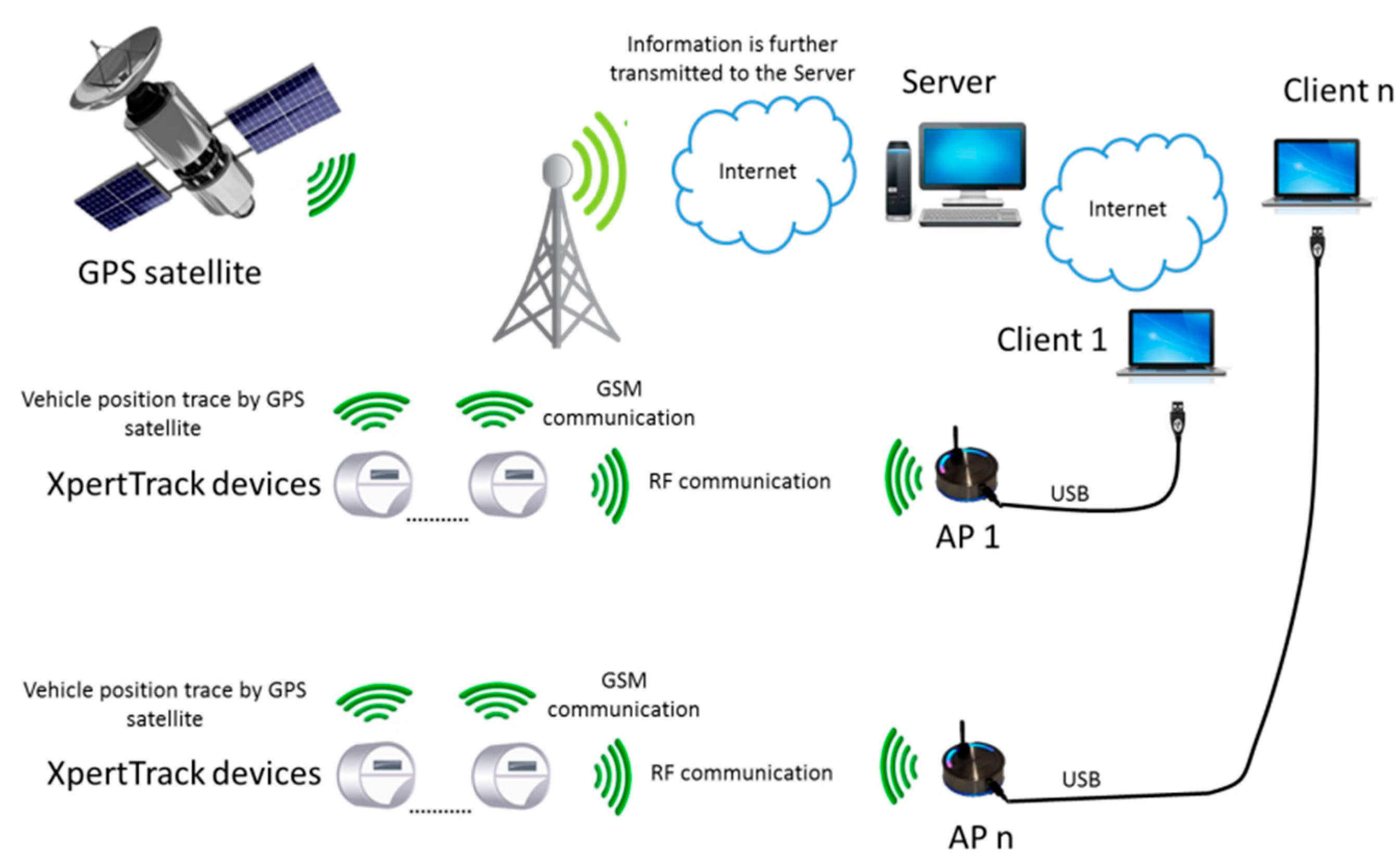 The messages are sent to a server specified by an URL (Uniform Resource Locator) or by an IP (Internet Protocol) address. The connection with the server can be performed on a specific port, for example HTTP (Hypertext Transfer Protocol) standard port (i.e., 80), or a custom one, for security reasons. When an alternative random port is used instead of the standard HTTP port a supplementary level of protection against unwanted access can be achieved. The protection consists in an unknown port and the access is granted using user and password credentials (each XpertTrack has a unique user and a password generated using a proprietary algorithm).