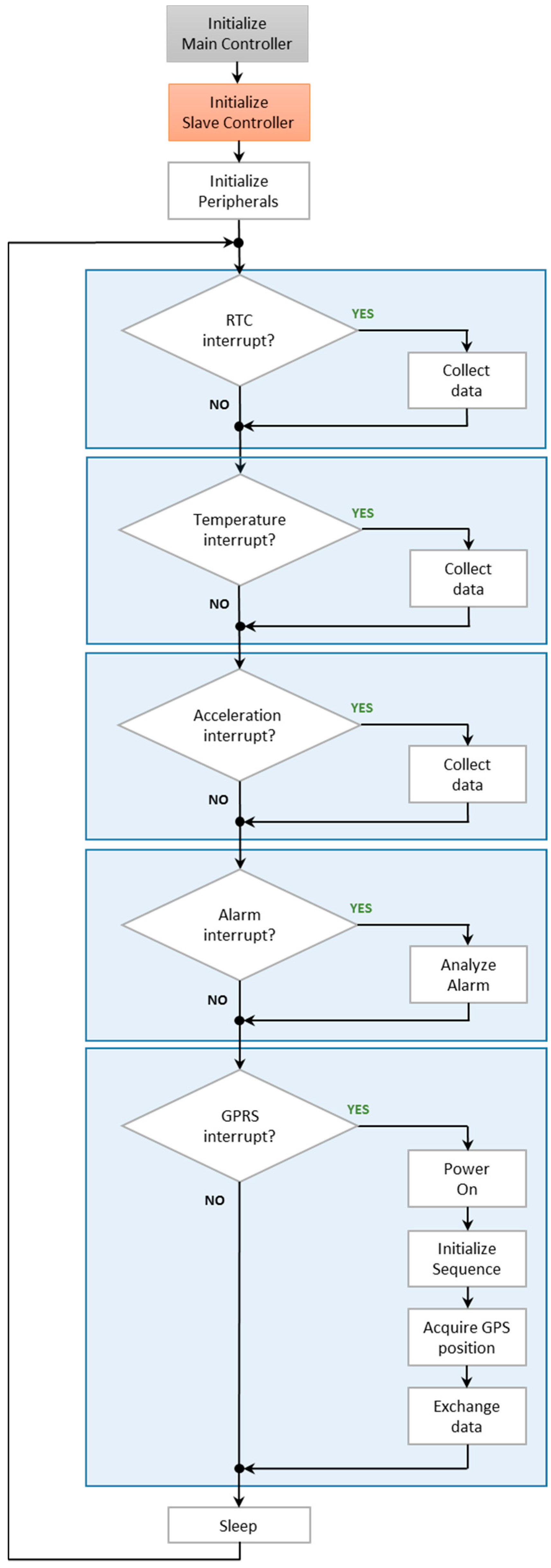 First step is to initialize the main microcontroller, then the slave microcontroller, and in the end all other peripherals are initialized. After all initializations have finished successfully, the main loop is started. From this moment on, the main microcontroller will run the interrupt routines, which are triggered by the peripherals. In the awake state, initiate by the RTC alarm, the temperature and all other parameters values are acquired. The new data are stored in the memory chip.