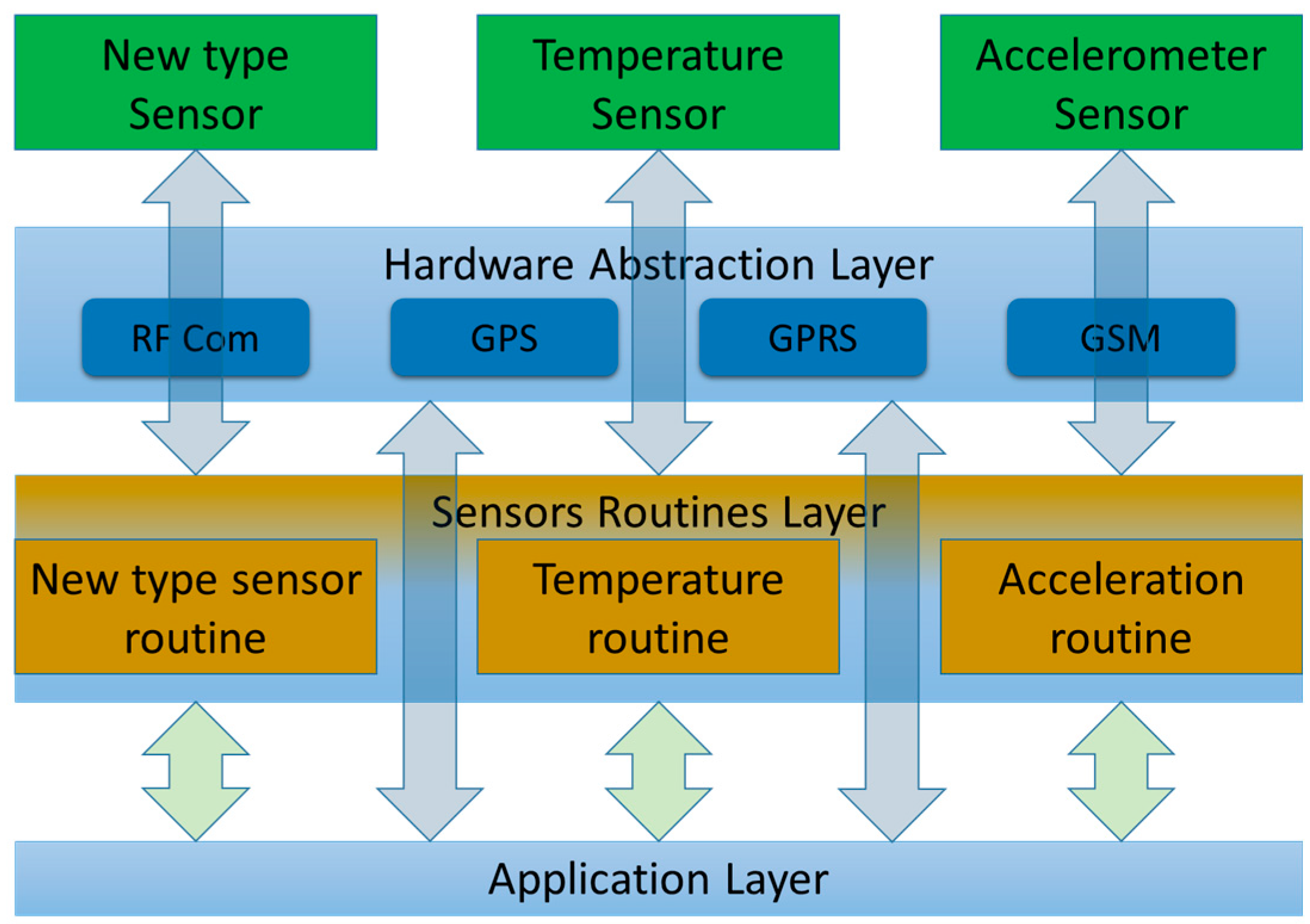 Due to its design, the microcontroller firmware can easily be modified to support new communications protocols or new types of sensors (see Figure 8). At the lowest level is the Hardware Abstraction Layer (HAL), where all communication protocols have been implemented. The code is split into modules, each one being responsible for one component. Each module calls HAL functions, processes the data and sends them (when requested) to the main program. Any modification to the design implies adding, changing or removing one or more modules.