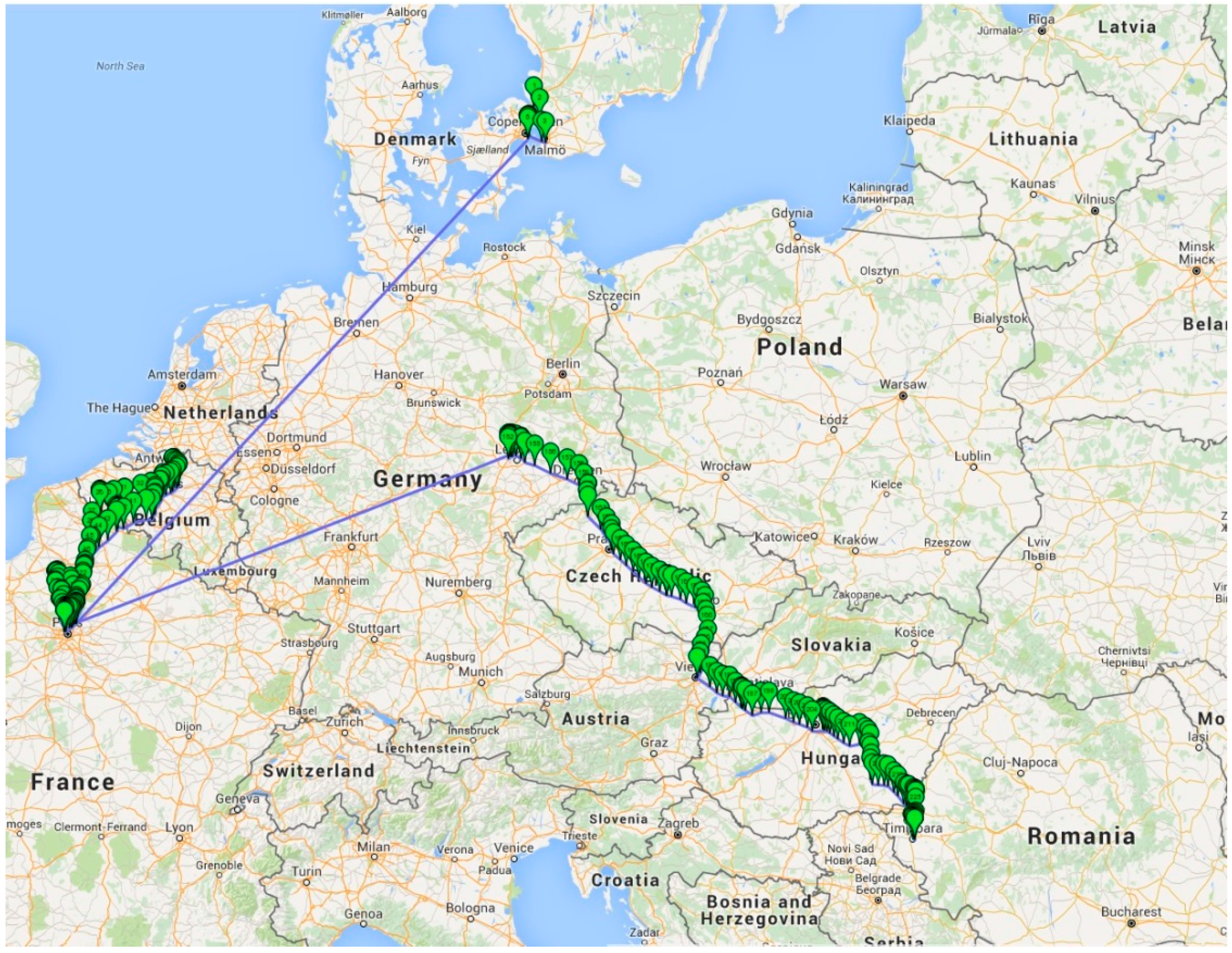 Besides testing in a controlled environment, real live testing was also done. Figure 9 and Figure 10 shows the test results of GSM positioning. As the GPS coordinates from the Figure 10 show, even if the connection is lost due to travelling by airplane (the long lines from Germany to France, and from France to Denmark), the transfer of data is re-established when GSM signal is redetected. Considering that the GSM penetration is far beyond the GPSs, especially if the XpertTrack is in a package in a metal container, it can be tracked almost everywhere on the globe.