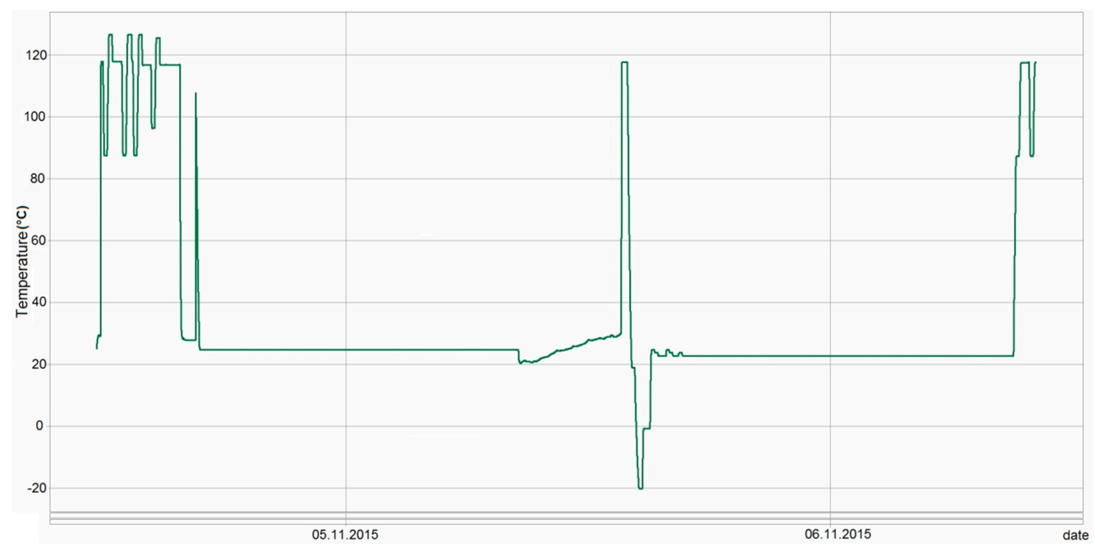 The communication quality was tested in harsh temperature ranging from −30 °C to +80 °C [25]. The communication between the two microcontrollers was monitored for 24 h and no errors were detected. Although the device was in a freezer at −30 °C or in an oven at +80 °C, the data arrived to the server without any loses.