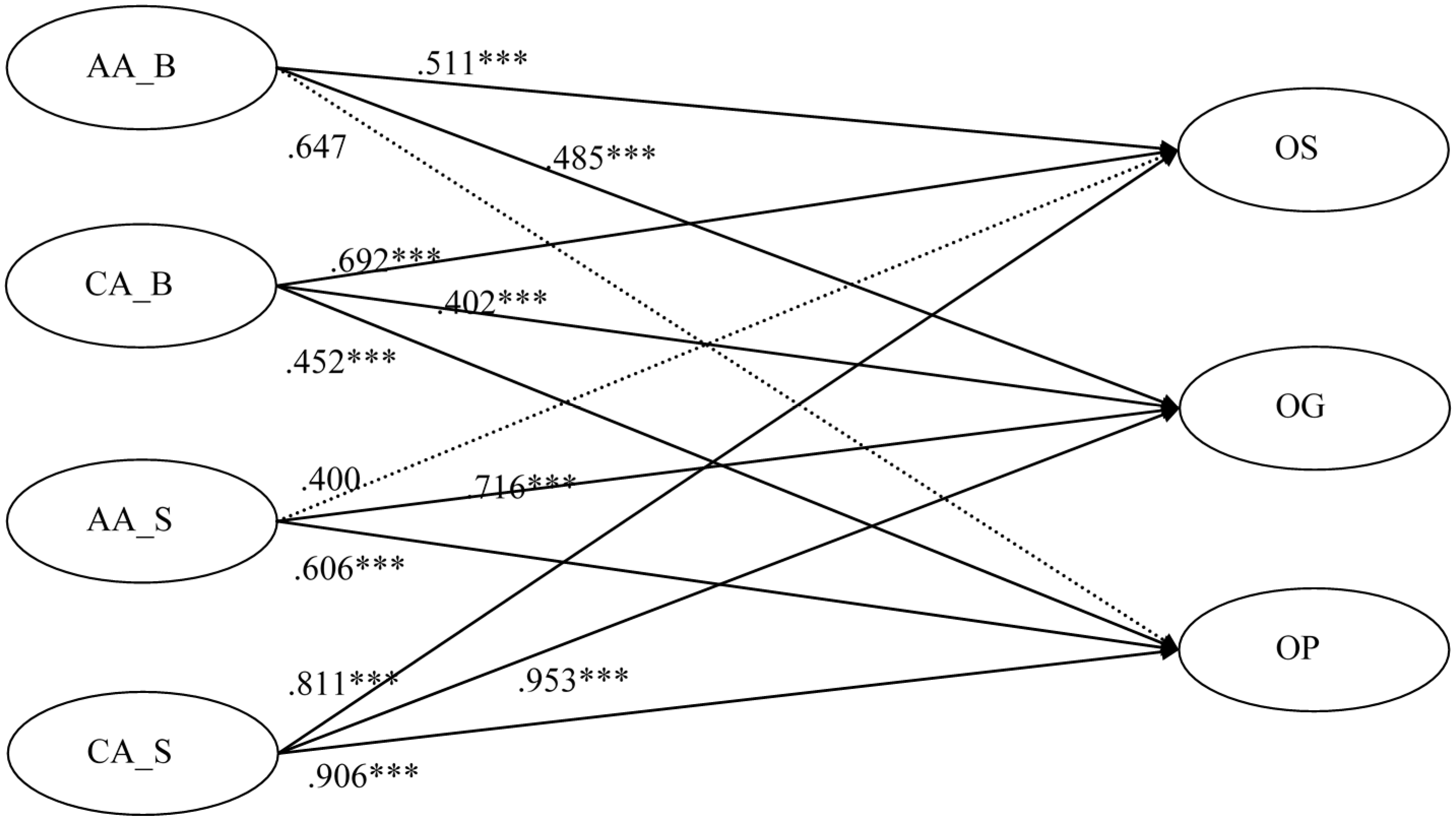 Research model with standardized path coefficients (Part 2). Note. * p < 0.05, ** p < 0.01, *** p < 0.001; AA_B = brand (product) related affective attitudes; AA_S = sensor computing platform related affective attitudes; CA_B = brand (product) related cognitive attitudes; CA_S = sensor computing platform related cognitive attitudes; OS = opinion seeking; OG = opinion giving; OP = opinion passing.