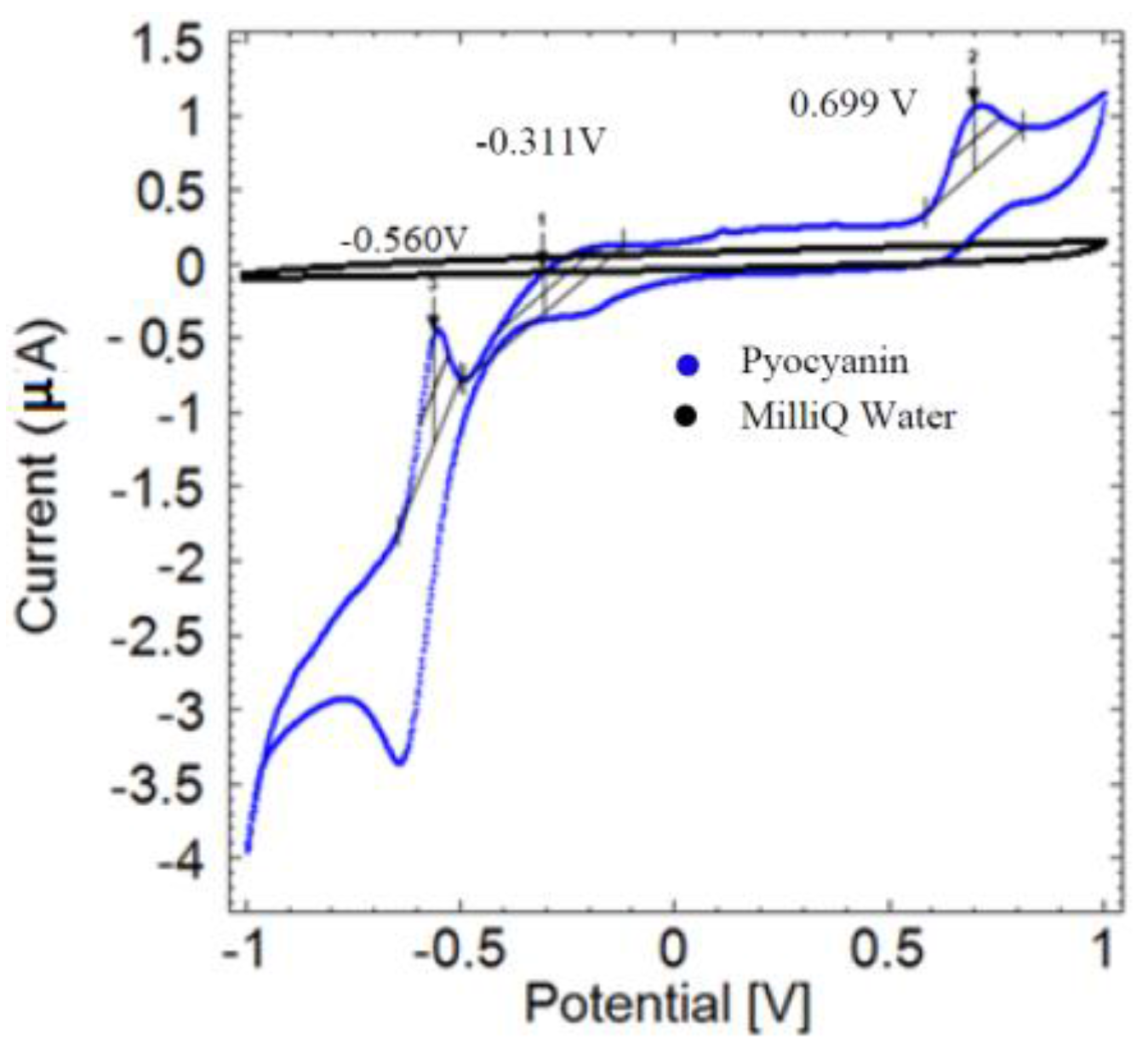The preliminary assessment of the electrochemical profile of pyocyanin using cyclic voltammetry shows several oxidation peaks at −0.560 V, −0.311 V and 0.699 V (Figure 1, blue curve). The MilliQ water control gave no peaks, as expected (black curve). It is likely that the peak at −0.311 V is equivalent to the pyocyanin peaks located around −0.25 V to 0.30 V reported by earlier studies [6,12,13].