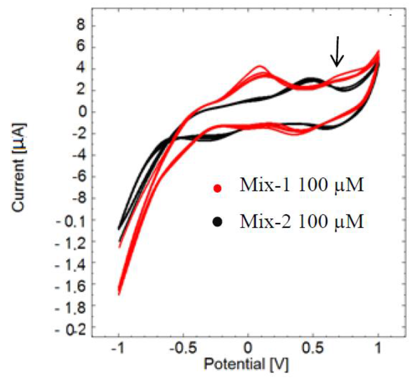 All the compounds were individually characterized by five cyclic voltammetry sweeps between −1.0 V to 1.0 V and sweep rates of 0.05 V/s using concentrations of 100 µM of each compound.