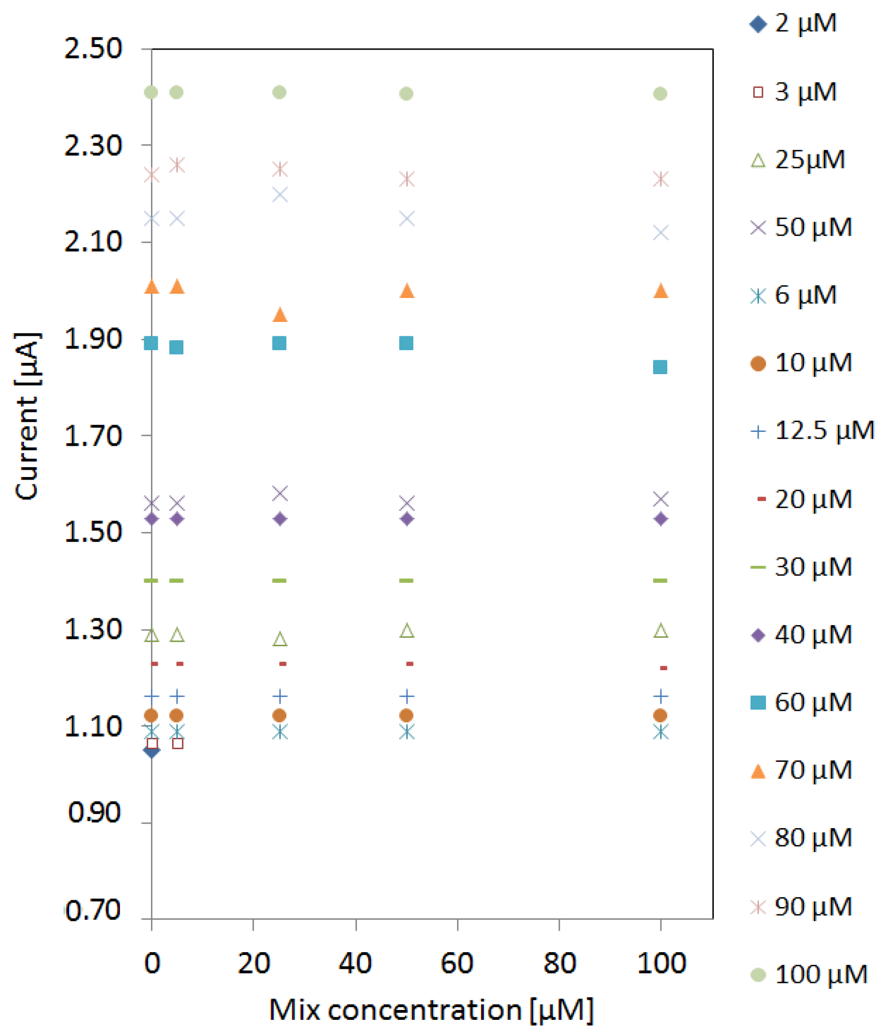 Detection of pyocyanin in different mix backgrounds between 5 µM and 100 µM in addition to pyocyanin detection in MilliQ water (zero mix background). The current peaks of the varying pyocyanin concentrations were unaffected by the mix concentration. Detection of 2 µM pyocyanin was only possible when no interfering signals were present. When the mix concentration was above 25 µM the detection limit of pyocyanin remained 6 µM.