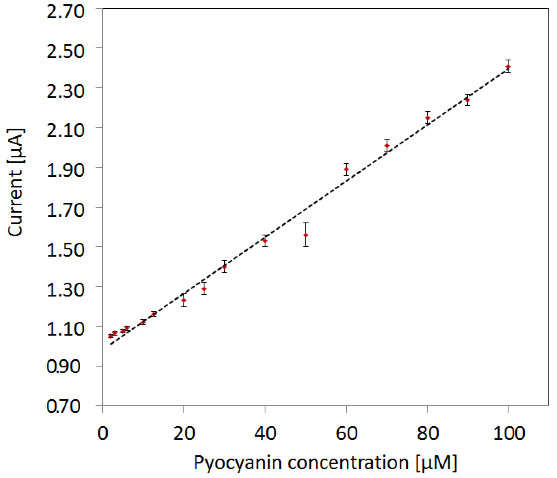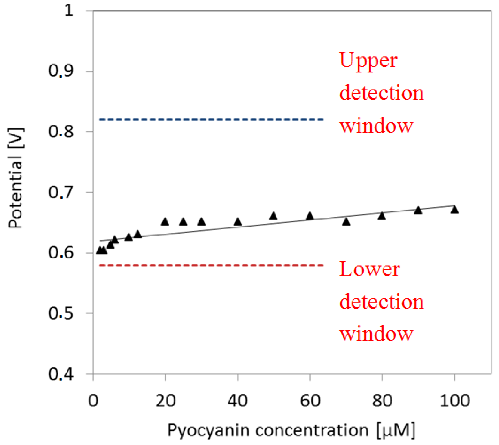 The peak potential of pyocyanin shifts slightly to higher values as a function of pyocyanin concentration (Figure 6). The fit indicates a slight increase of potential as a function of concentration. As the pyocyanin concentration decreases, the corresponding potential peak approximates the lower limit of the pyocyanin detection window. This may explain the detection limit around 2 µM.