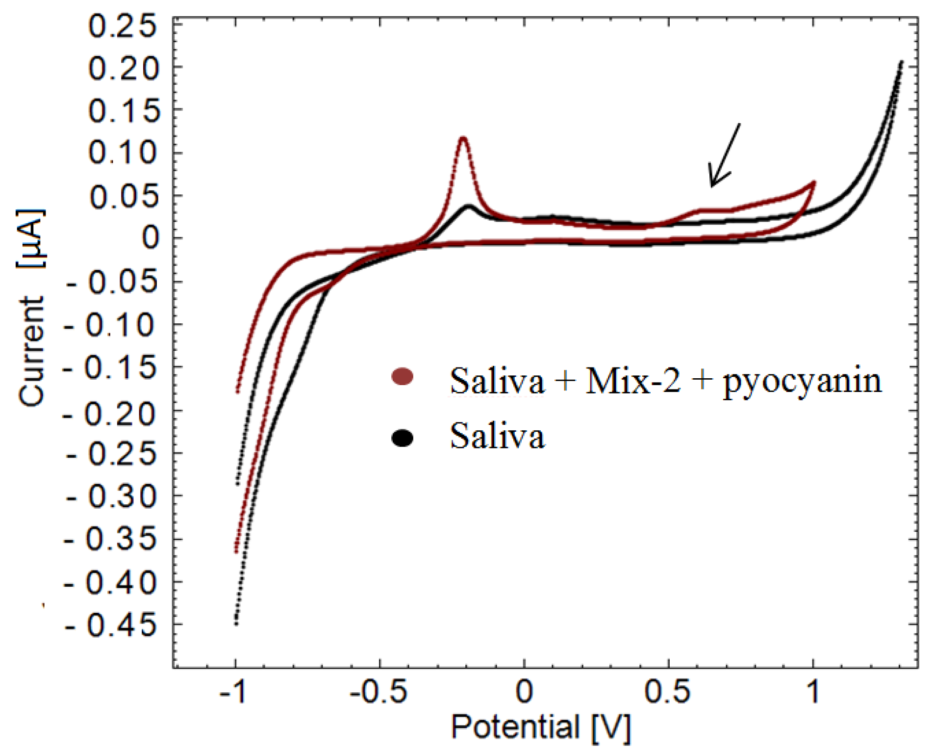 Example of pyocyanin detection in human saliva sample. Black illustrates a cyclic voltammogram of human saliva without pyocyanin. Dark red cyclic voltammogram is of human saliva containing pyocyanin and mix. The peak around 0.60 V versus the reference electrode confirms the presence of pyocyanin in the sample (arrow).