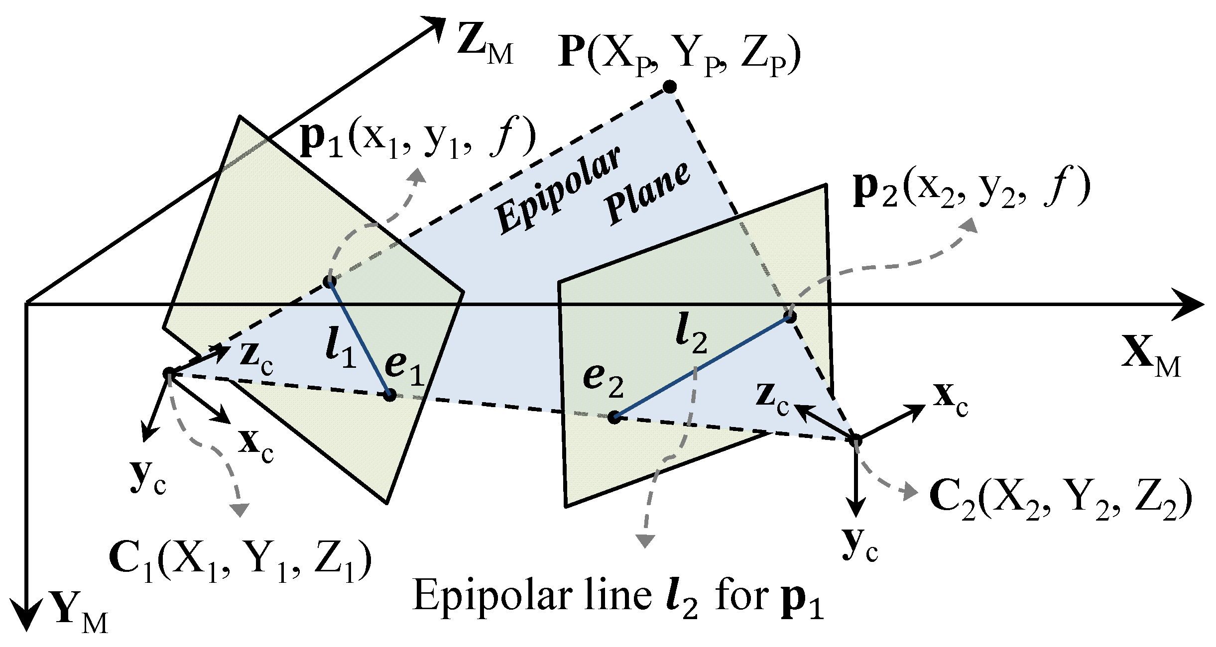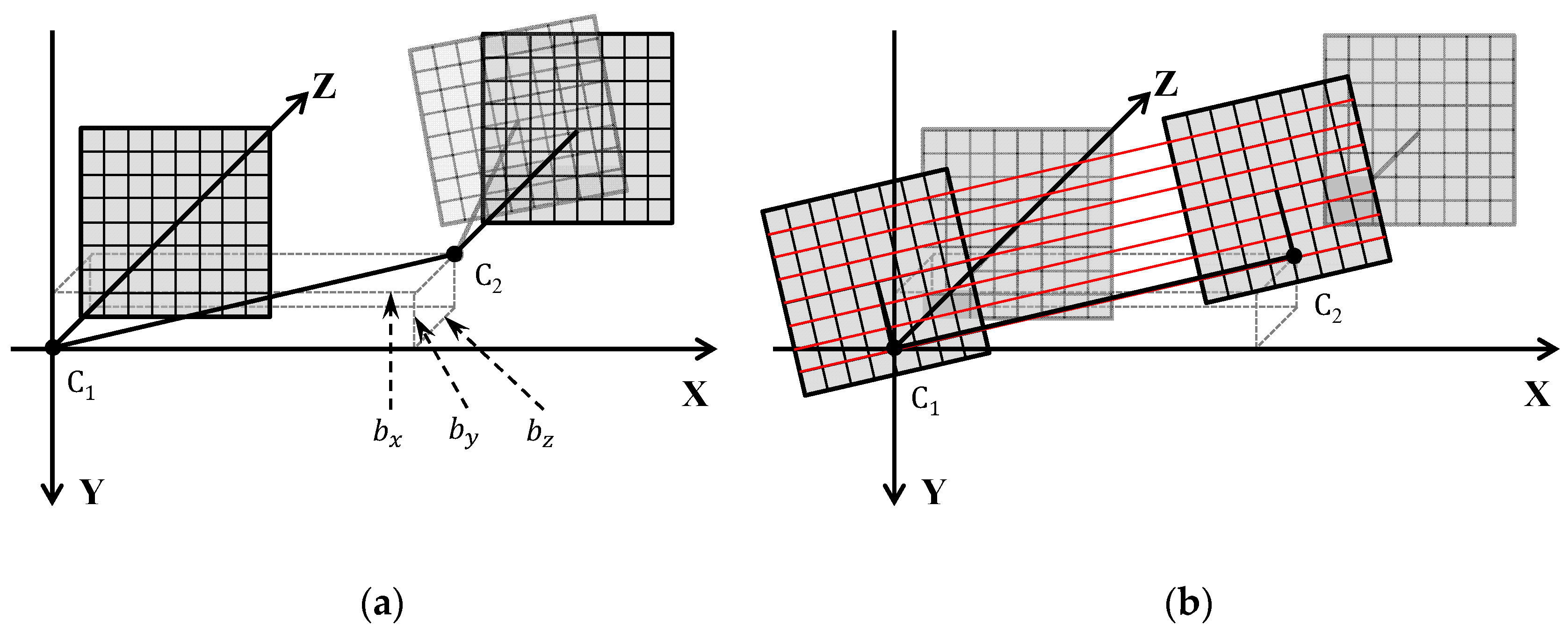 In the calibrated approach, intrinsic and extrinsic parameters for the left and right images are estimated separately by the stereo calibration method using dedicated calibration patterns [12,13,31,32]. Extrinsic parameters are used to estimate the relative geometric relationship between the two images. The homography for epipolar resampling is then defined by the relative geometric relationship.