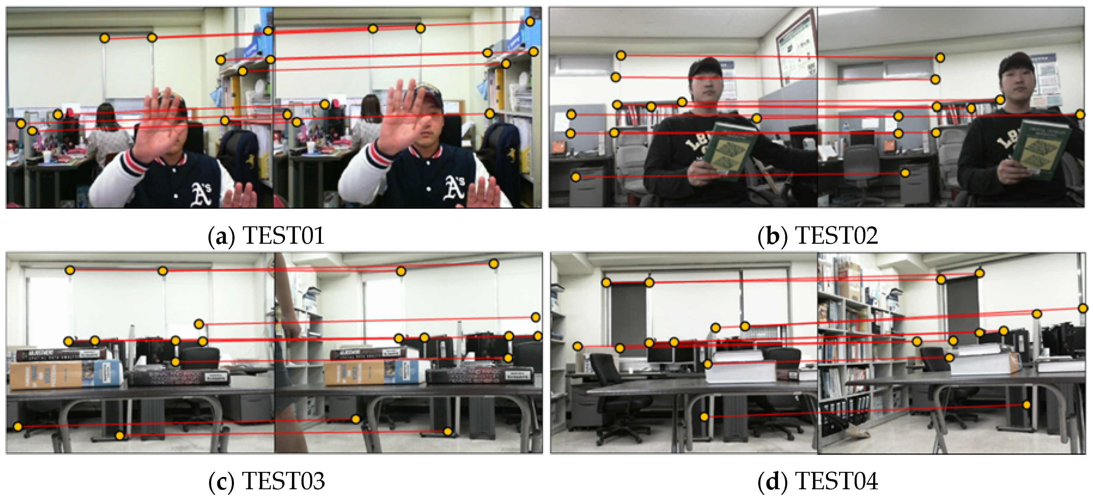 For comparative analysis of the epipolar resampling methods, four stereo image sequences (TEST01, TEST02, TEST03, and TEST04) were obtained by two webcams (Microsoft Webcam Cinema). The four image sequences were designed so that error factors were increased from TEST01 to TEST04. Two sequences (TEST01 and TEST02) were obtained in a low resolution mode with an image size of 320 × 240 pixels and two (TEST03 and TEST04) in a high resolution mode with 640 × 480 pixels. Each sequence was obtained with different baseline distances and different camera tilt angles (see Table 1). This was to check the effect of wider baseline and larger tilt angle on epipolar resampling performance. For each sequence, 100 stereo pairs were acquired without camera movement to analyze the consistency of geometry estimation with respect to change of tie-points among different pairs.