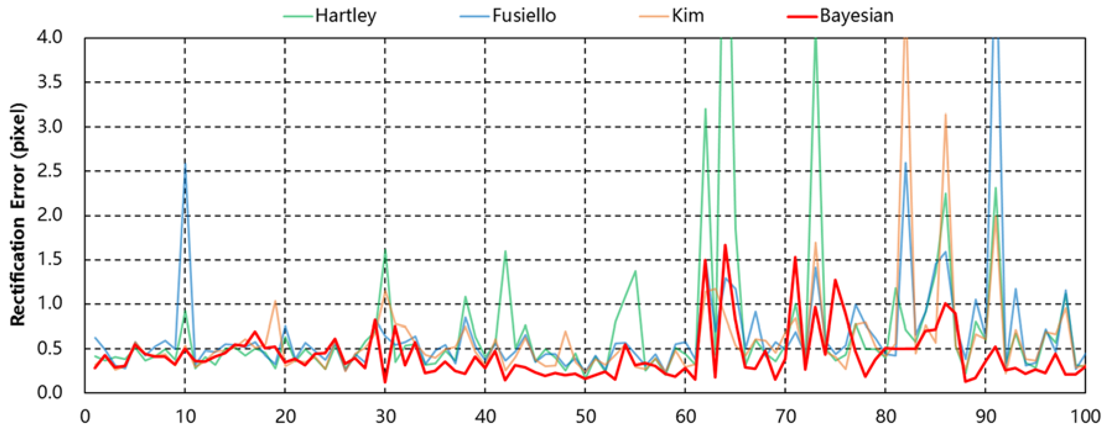In the results of TEST01 and TEST02 datasets, all methods showed satisfactory results in terms of rectification errors. These results demonstrate that although mismatched tie-points are partly included, acceptable transformation accuracy can be produced if the camera configuration is favorable. However, in the case of TEST03 and TEST04 datasets, rectification errors were increased for all test methods. In particular, a large error increase was observed for the uncalibrated epipolar resampling methods, Hartley and Fusiello. This observation agrees well with previous investigations showing that the uncalibrated methods were more prone to tie-point errors in weak stereo geometry [10,11]. The uncalibrated methods also show larger image distortion. This distortion was observed over the whole datasets compared to the results of the Bouguet method. In this experiment, the two photogrammetric methods, Kim and Bayesian, showed almost identical results. It can be interpreted as that effect of tie-point errors was handled better than in the uncalibrated methods by estimating relative orientation parameters directly. A slight rectification error increase for the Kim and Bayesian was observed with TEST04 due to the wide baseline and large tilt angle.