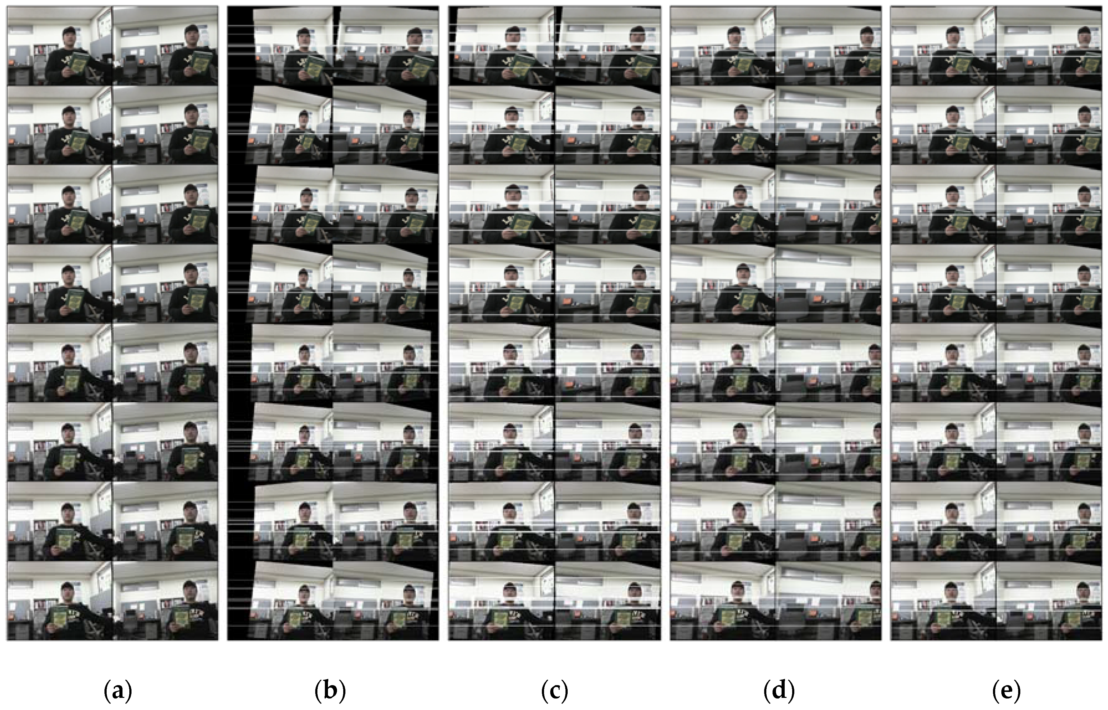 A portion of the results from the consecutive rectified images of TEST02. From left, (a) original image and results of the (b) Hartley, (c) Fusiello, (d) Kim, and (e) Bayesian methods.