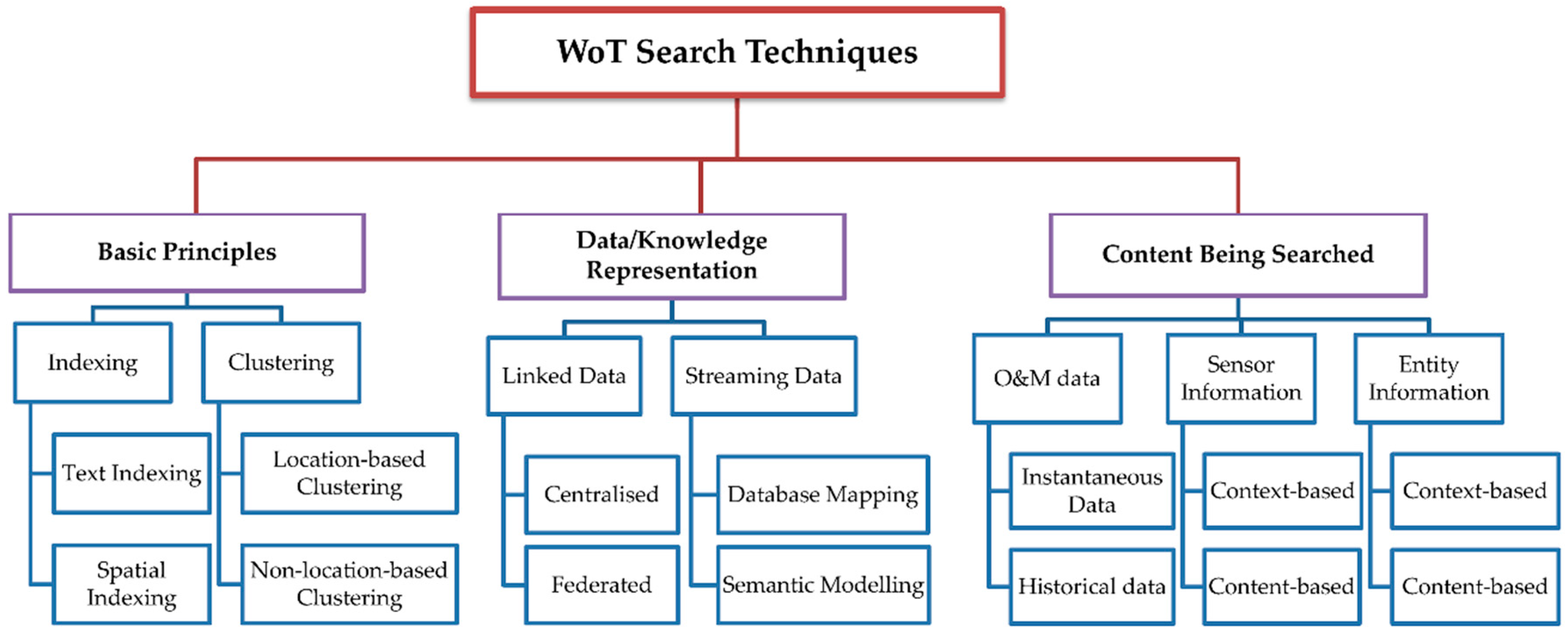 Search as a topic has been investigated for decades; but existing techniques cannot be directly applied and need to be adapted to support search in the WoT. This section provides a classification that focuses on the underlying techniques and principles essential for search in WoT. Two broad categories of methods can be identified according to this classification, i.e., indexing and clustering.