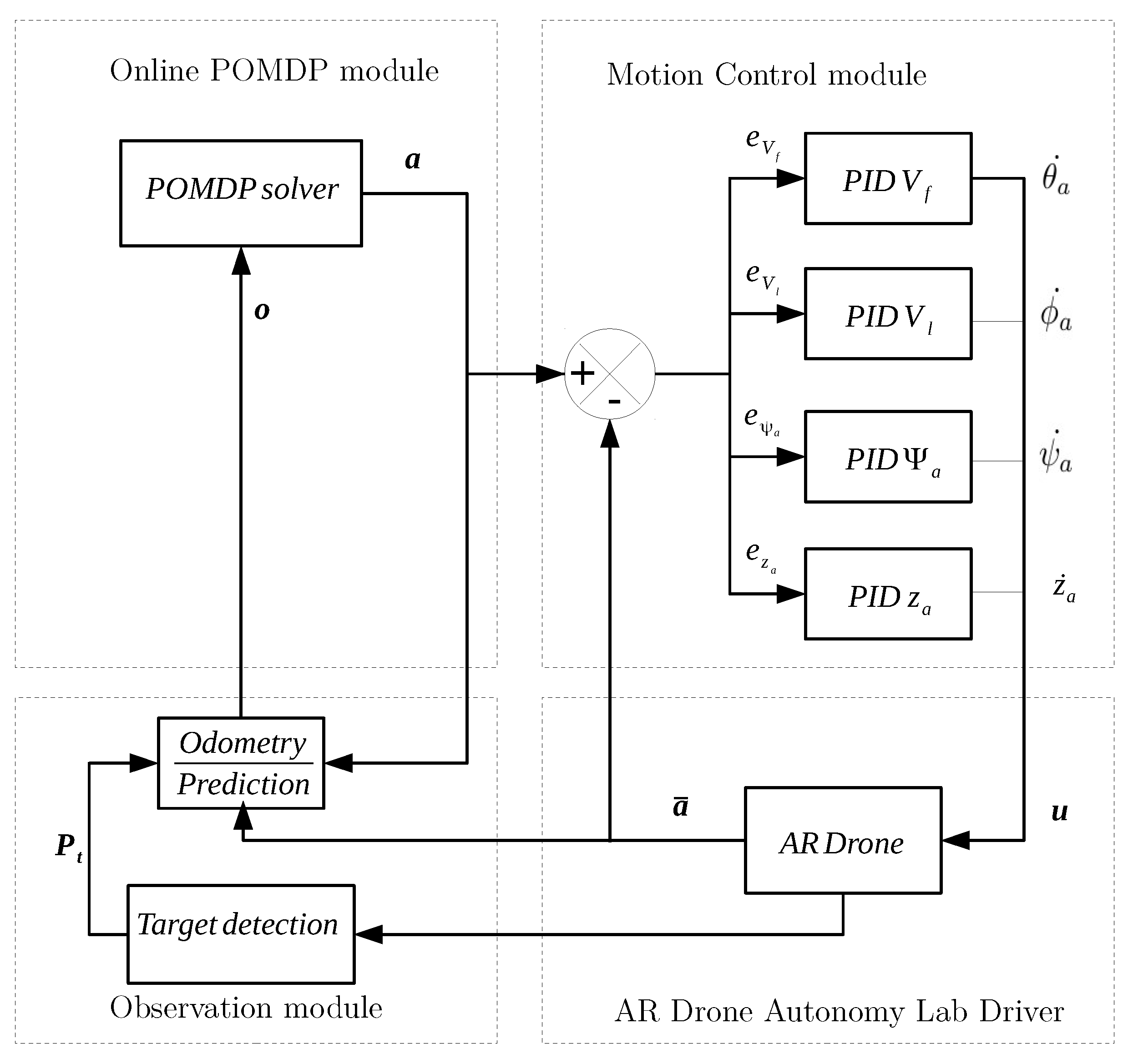 The on-line POMDP module runs the on-line POMDP planning algorithms. This module initialises the parameters for planning horizon h, the map of the environment, target location, odometry uncertainty and an initial belief state . This module produces a policy π based on the initial belie state and outputs the action a to be executed according to the calculated policy. The action a is then executed by the motion control module, and the observation module calculates the UAV position using the on-board sensed velocity, altitude and heading angle. The observation module also checks whether the target is detected by the downward-looking camera and detects obstacles located within approximately 1 m in front of the UAV with an on-board front-looking camera.