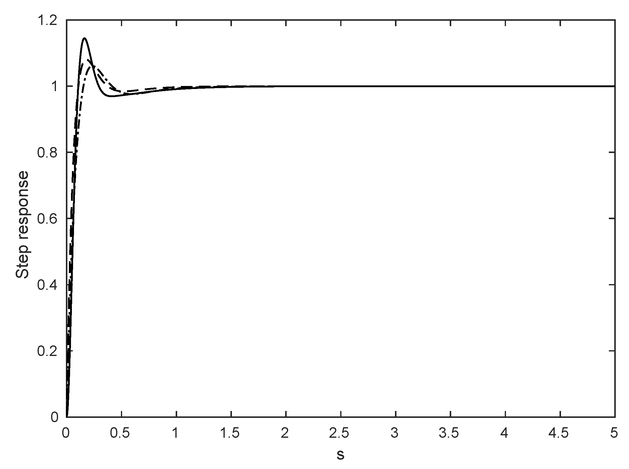 PID time responses to a unit step input for and (dashed line), Ψ (dash-dot line) and z (solid line). All PID controllers reach steady state within 1 s.