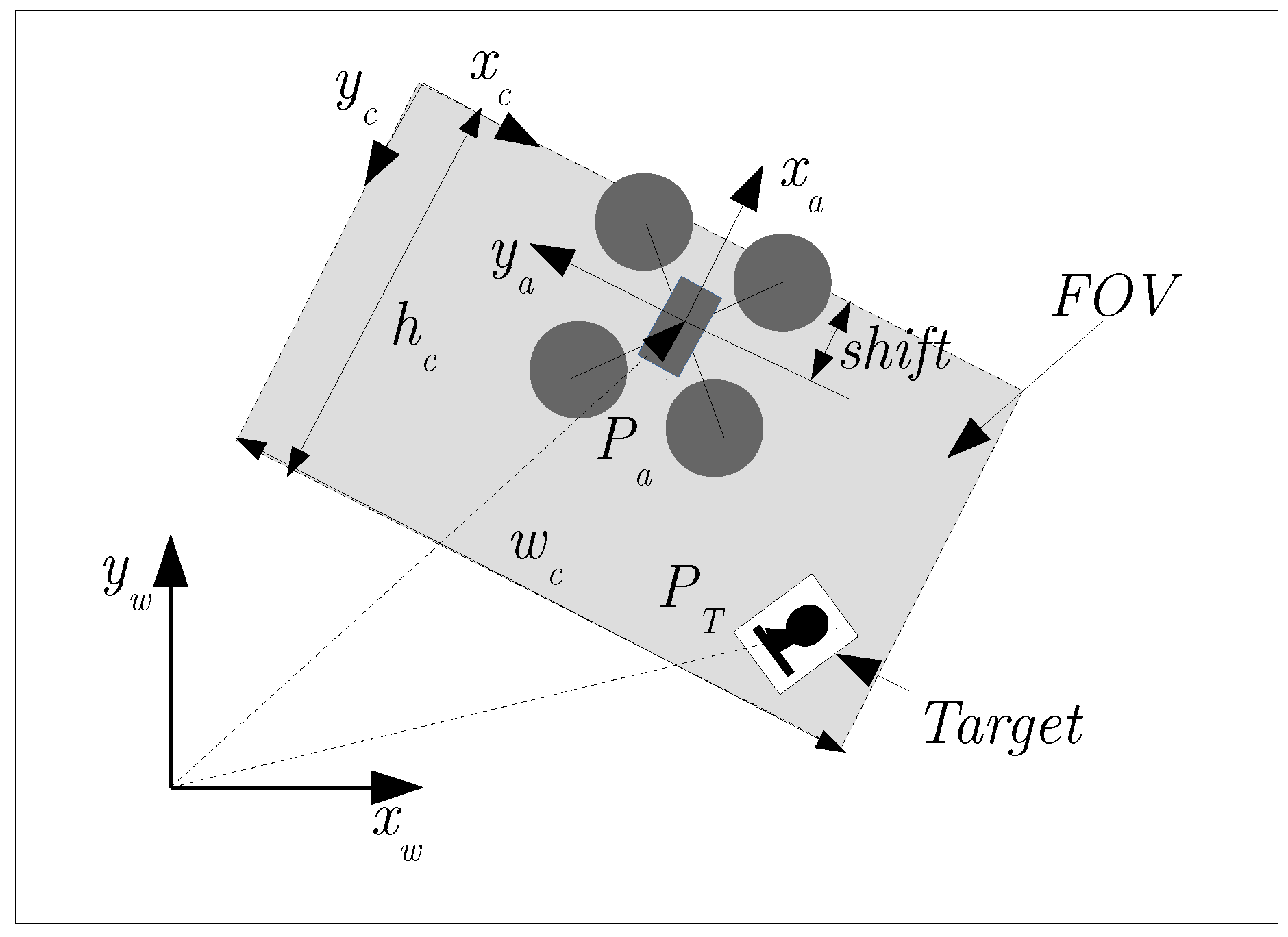 The observation module calculates the current multi-rotor position and heading angle based on the sensed forward and lateral velocities, accelerations and the measured yaw angle . The forward and lateral velocities in the UAV’s frame are transformed to the fixed world frame and are integrated to calculate the UAV coordinates and in the world frame. The UAV altitude is also read from the AR Drone ROS driver and is calculated on-board.