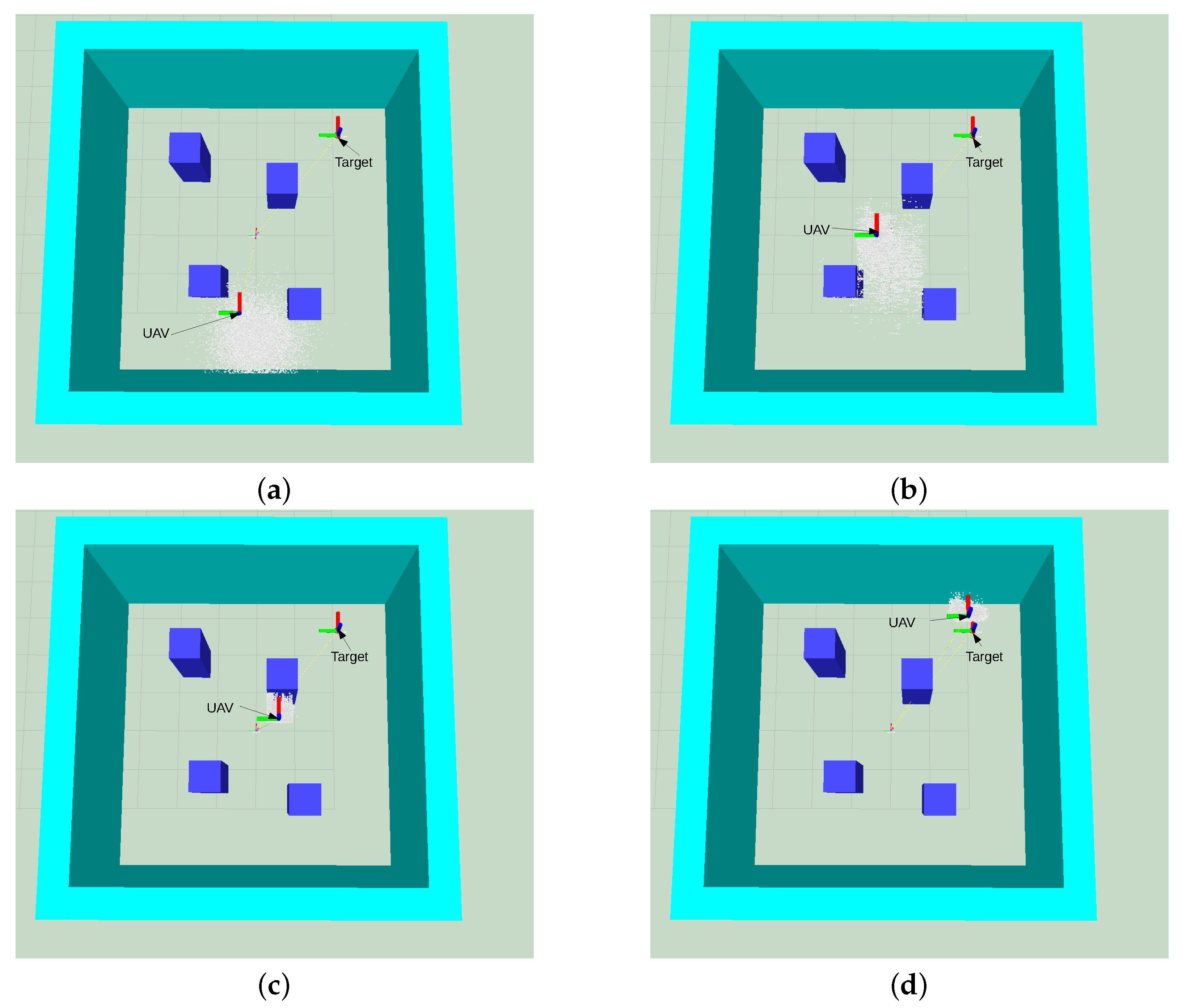 The target was placed at four different locations inside the flying area, and the UAV was initially located around , with uncertainty in each of the locations, as described by Equation (1). Each target location was tested in simulation by running POMCP and ABT 100 times. We created a simulated 3D model of the environment to visualise the UAV path in the scenario to inspect the evolution of the belief state of the system and for visualising the UAV position and the target location as clouds of white and red particles, respectively (Figure 5). Initially, the UAV position, represented by the white particle cloud in Figure 5a, has an uncertainty around the starting position at the bottom of the image. The spread of the particles represents the drift caused by UAV take off and initial hovering. This uncertainty increases as the UAV flies towards the goal (Figure 5b). As the UAV gets closer to one of the obstacles and detects the AR tag attached to the obstacle with the front camera, the uncertainty in the UAV position is reduced, as seen in Figure 5c. The UAV then flies towards the target until it detects it, shown in Figure 5d, and the uncertainty in its position is reduced by the knowledge that it acquires from the position of the target in the image taken by the downward-looking camera.