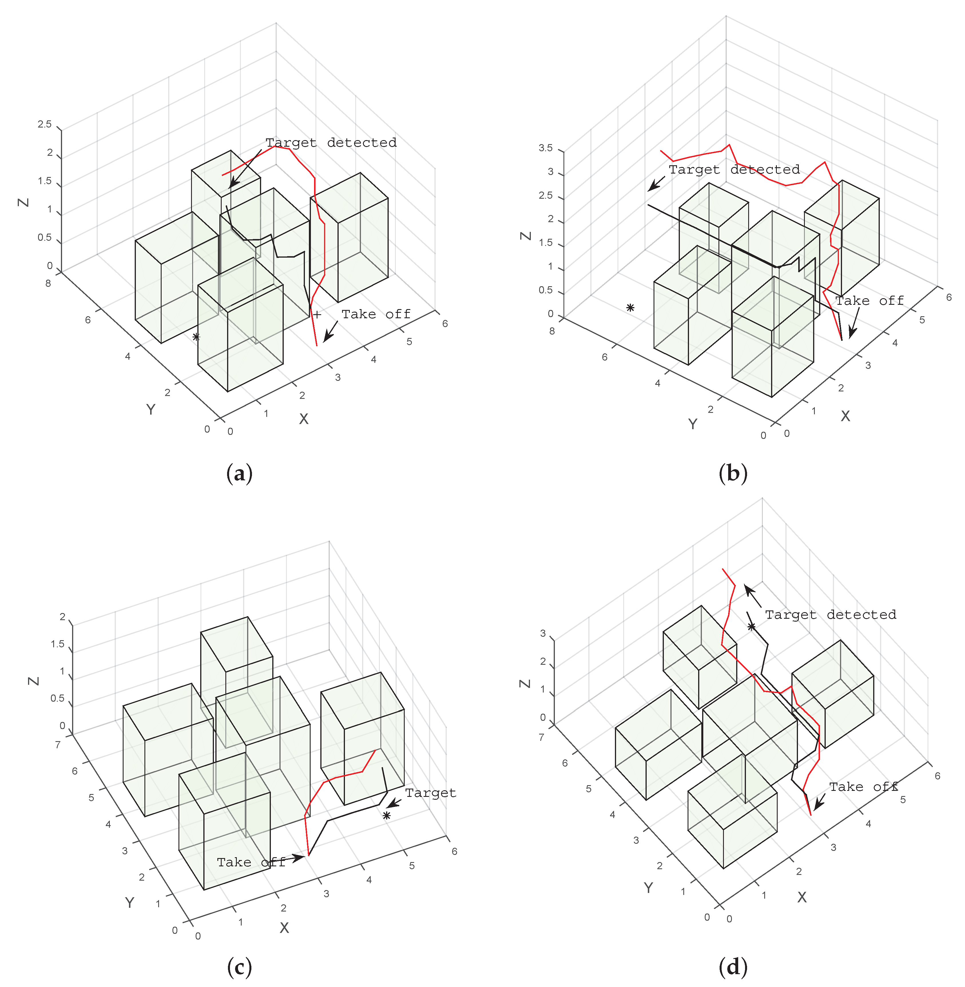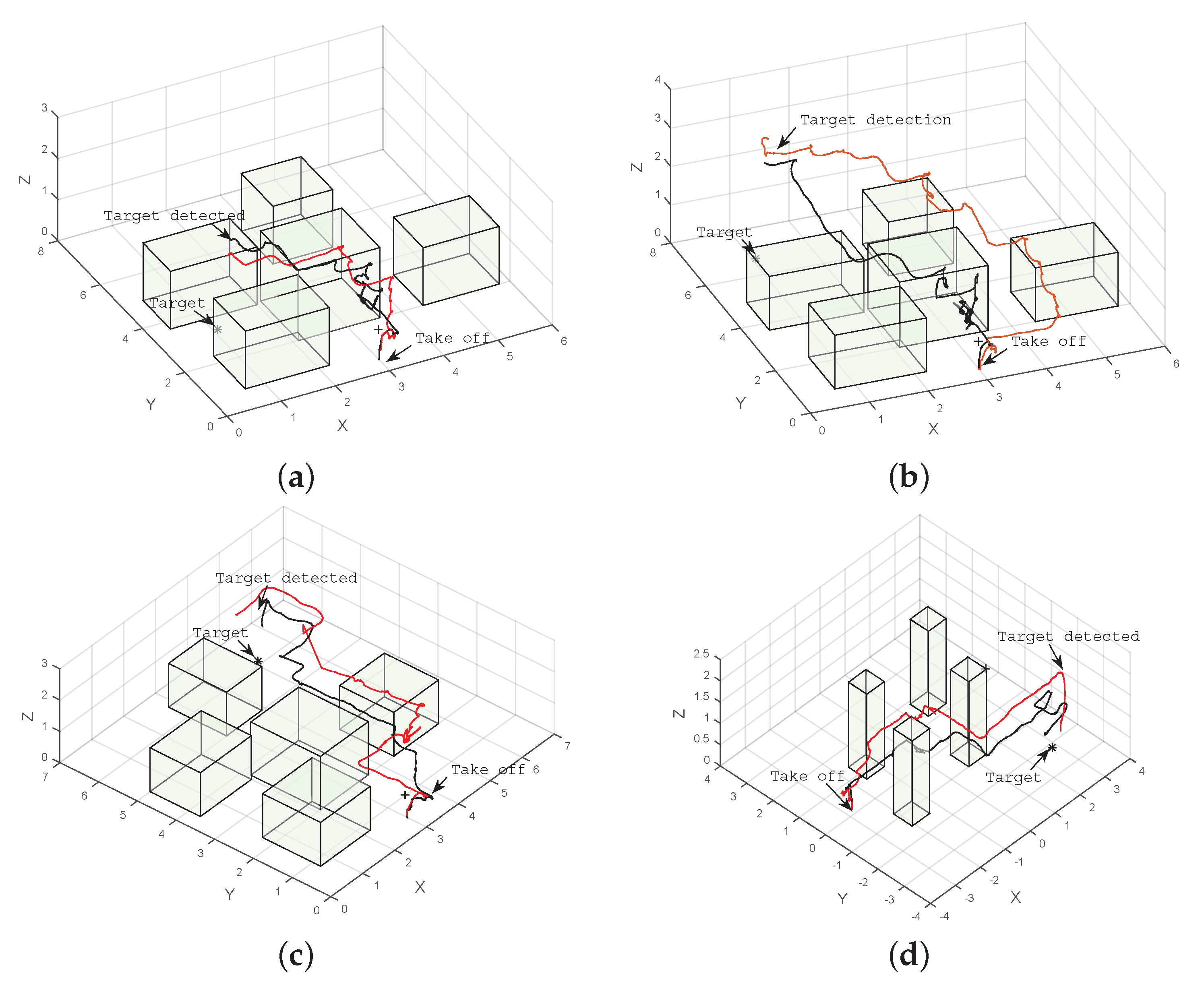 Figure 9a–c show the trajectories taken by the UAV in a scenario with five obstacles. In this case, both solvers show that it is safer to fly over the obstacles to reach the target. On the other hand, Figure 9d shows that the algorithms find a safe route to the target by flying between obstacles in the scenario with four obstacles. However, in the last case, the UAV flies close to the obstacle first in order to reduce its uncertainty by detecting the beacon or landmark represented by the AR tag on the obstacle and then continues flying towards the target.