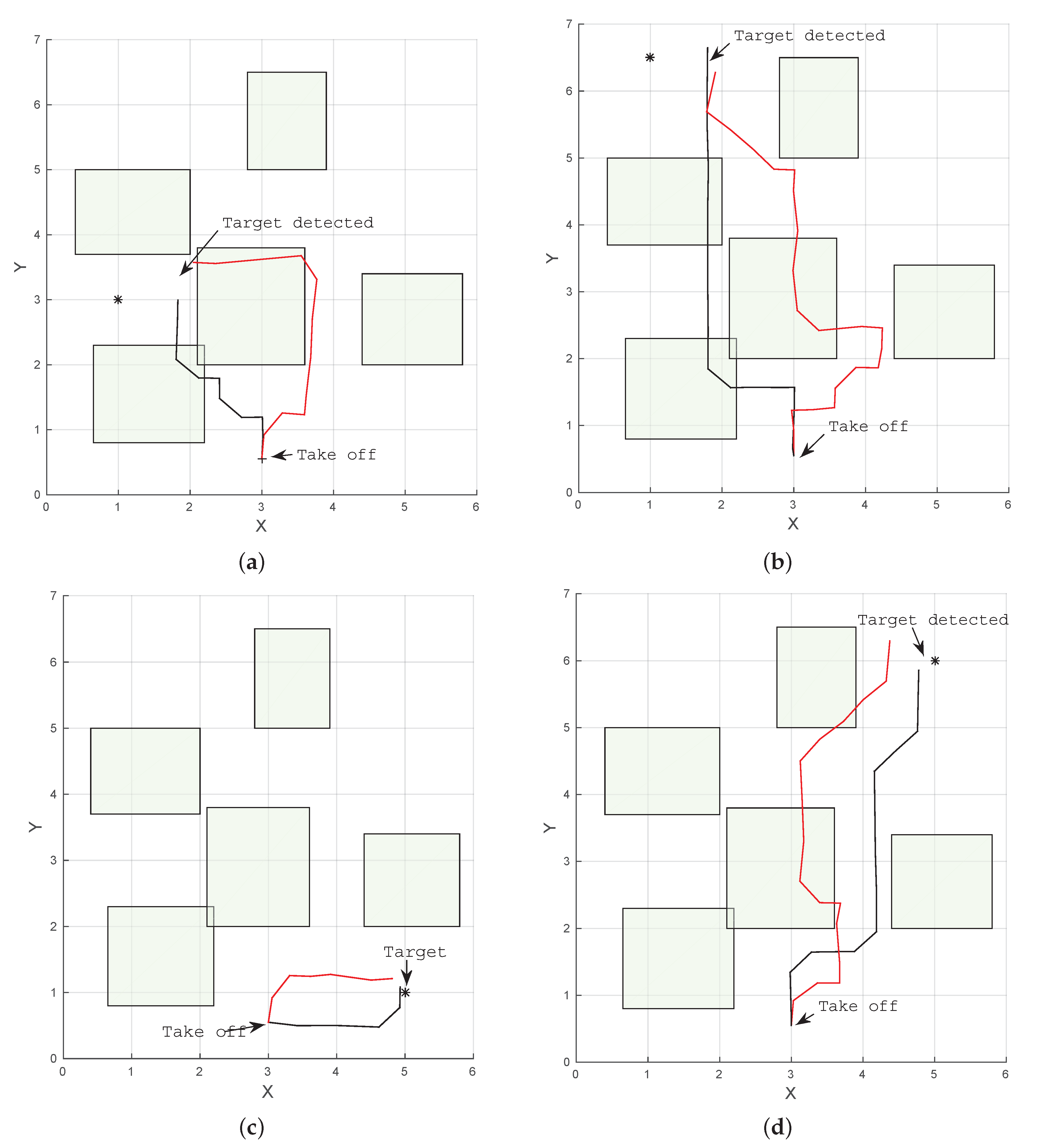 The results indicate that for all cases in the simulation, both POMDP solvers were able to reach and detect the target in less than 20 s. Results also show that paths produced by ABT are shorter than the ones produced by POMCP (Figure 6 and Figure 7). This can also be seen in the flight time to detect the target, which is shorter for ABT in three of the four cases; see Table 3. In the case of the target located at , the path computed by ABT shows that the UAV takes a trajectory flying between the obstacles, whereas with POMCP, the UAV flies over the obstacles to avoid the risk of collision.