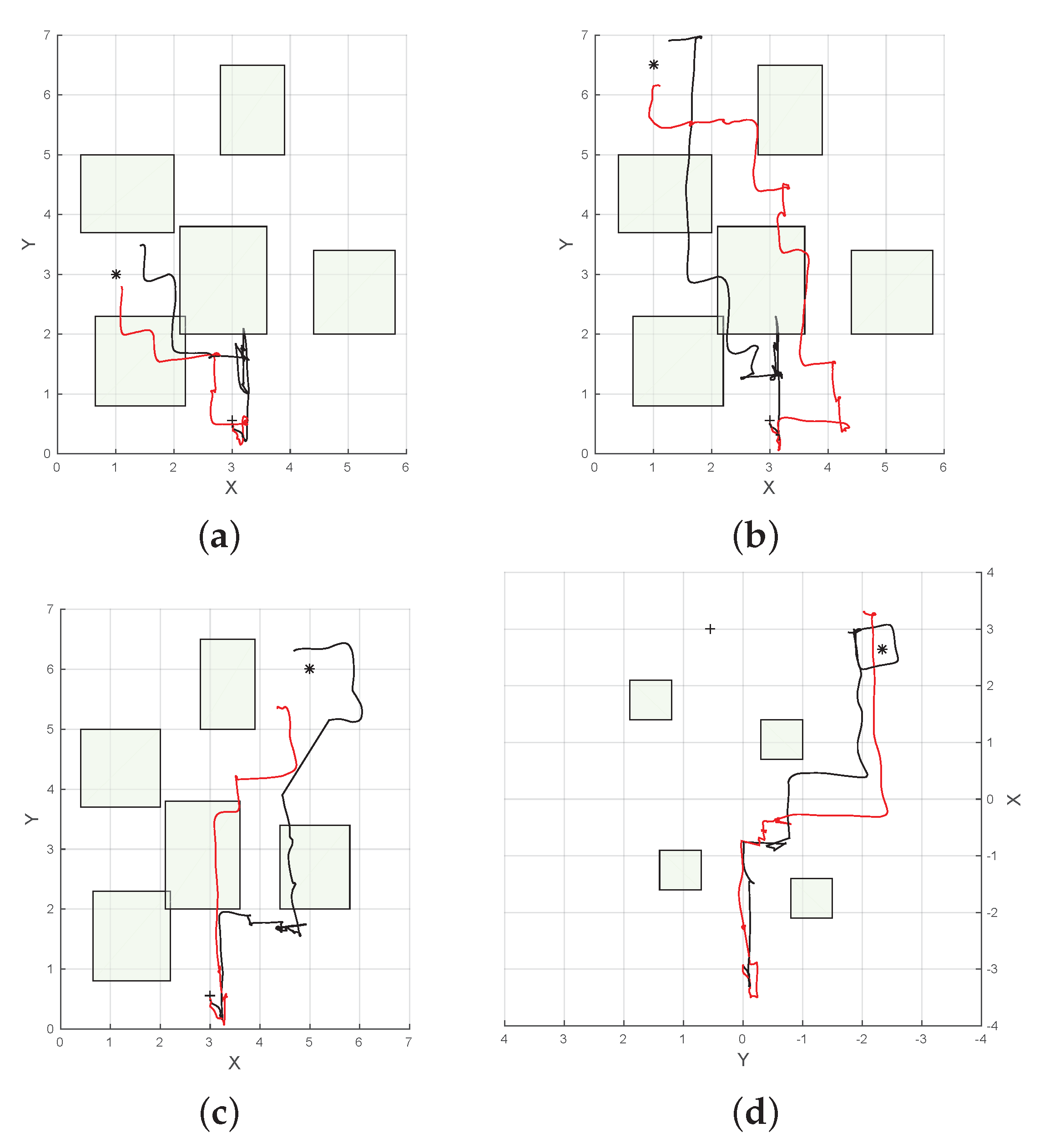 Example of trajectories to four different target locations produced by ABT (black) and POMCP (red) in simulation. (a) Target located at (1.0, 3.0, 0.15); (b) target located at (1.0, 6.5, 0.15); (c) target located at (5.0, 1.0, 0.15); (d) target located at (5.0, 6.0, 0.15).