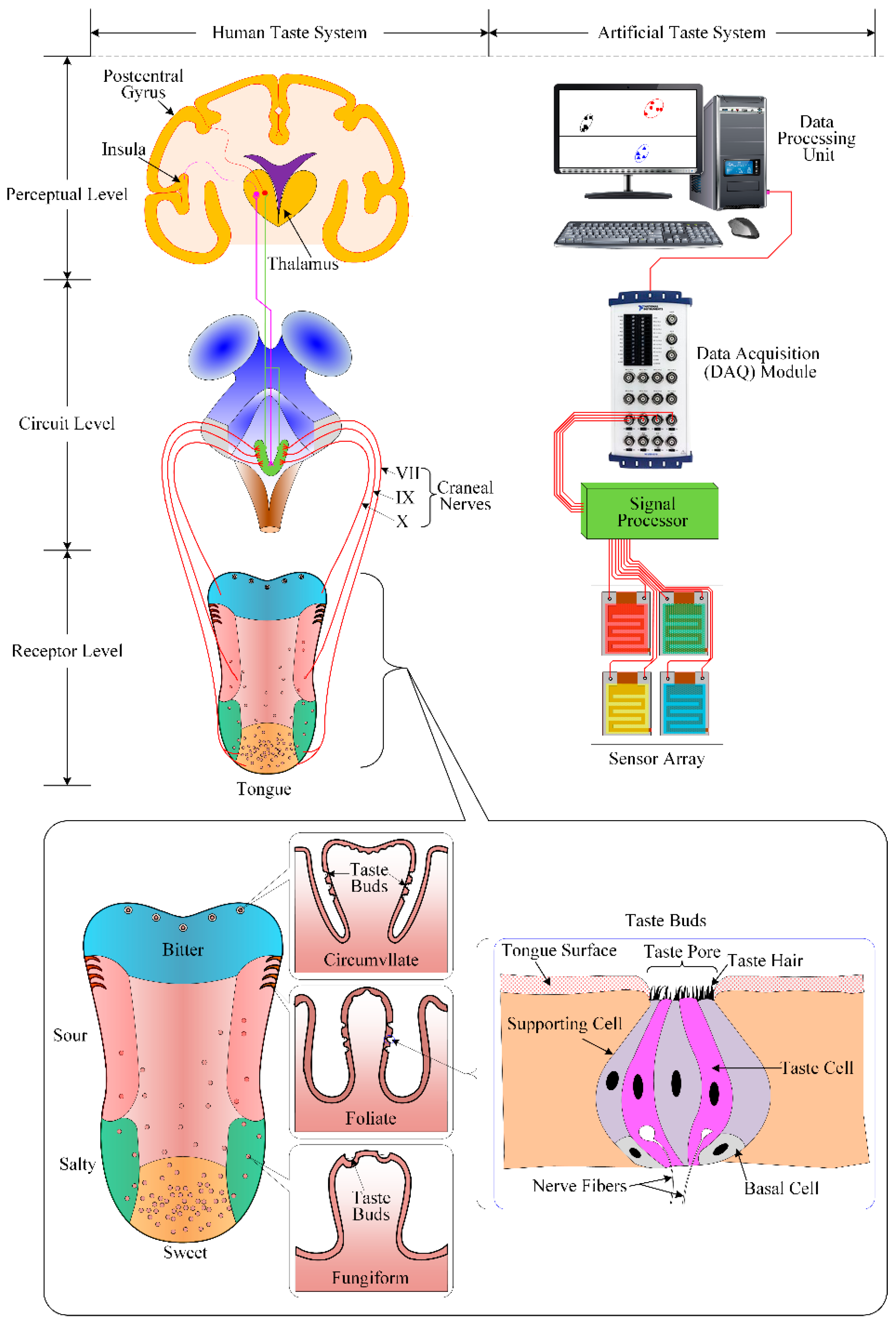 The human/biological tongue offers different sensitivities at different regions: the tip of the tongue is most sensitive to sweetness and saltiness, the sensation of sourness is best sensed on the lateral sides of the tongue, and the maximal sensitivity to bitterness appears on the back of the tongue. To feel the taste of food, the taste pores in the oral cavity absorb the chemicals of food. The taste cells in the taste buds collect these chemical stimuli and create nerve impulses. The taste impulses from the tongue are first transferred to specialized cells in the brain stem by two nerves (the facial nerve and the glossopharyngeal nerve) for initial processing. The taste impulses then ascend to the thalamus. After further analysis in the thalamus [59,60], the taste information is relayed to the part of the cerebral cortex that intervenes in the conscious appreciation of taste. The sensorial information about temperature and texture from the tongue triggers also a cortex response [61].