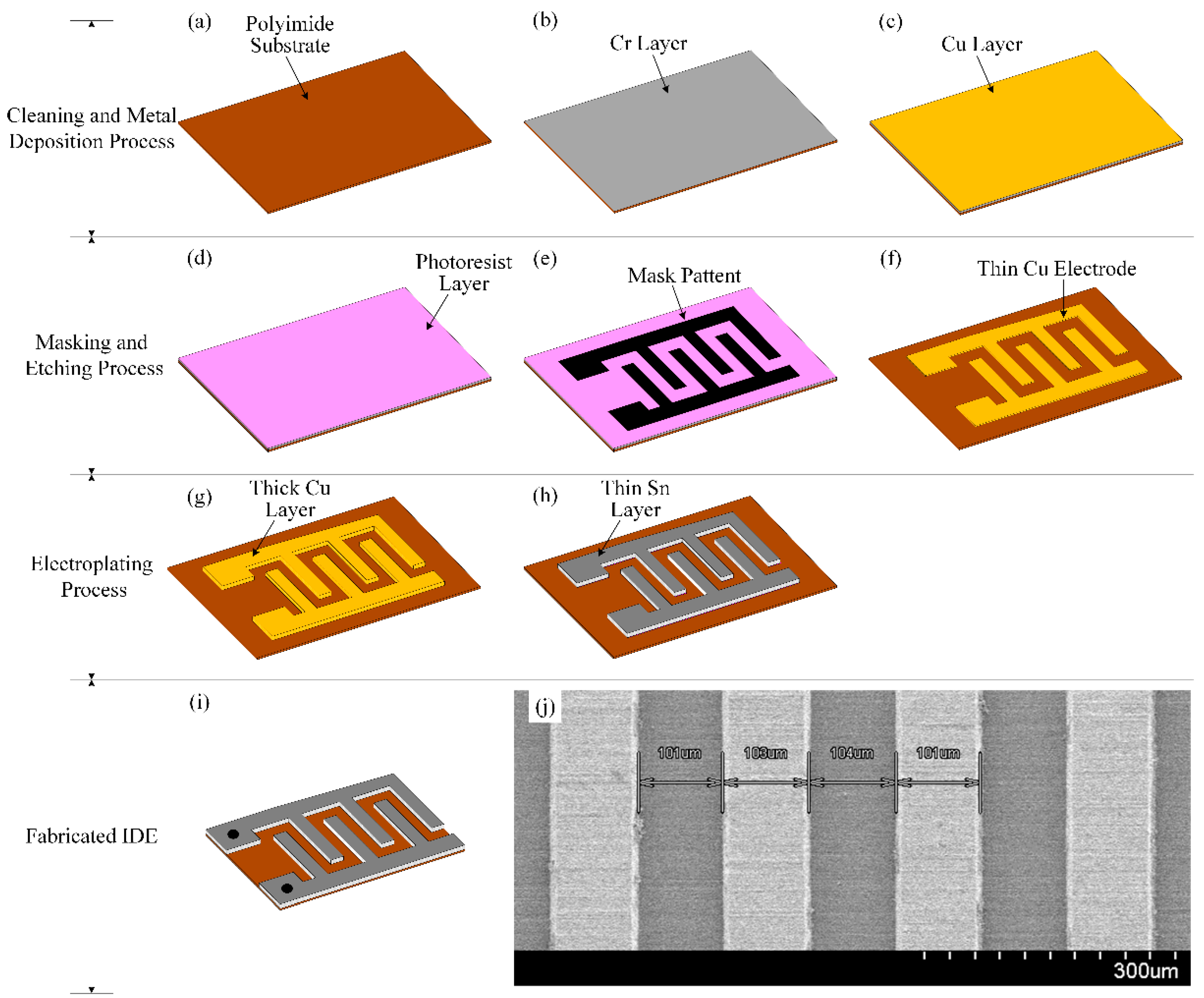 Preparation procedure of the IDE: (a) polyimide substrate; (b) thin Cr layer on the polyimide substrate; (c) depositing a thin Cu layer on the Cr layer; (d) photoresist layer, (e) transferring the mask pattern onto the photoresist layer; (f) etching the unmasked metal layers; (g) depositing the thick Cu layer onto the thin patterned Cu layer via electroplating; (h) depositing the thin Sn layer onto the thick patterned Cu layer; (i) cutting the residual polyimide substrate; and (j) SEM image of the surface of the interdigitated electrode (IDE).