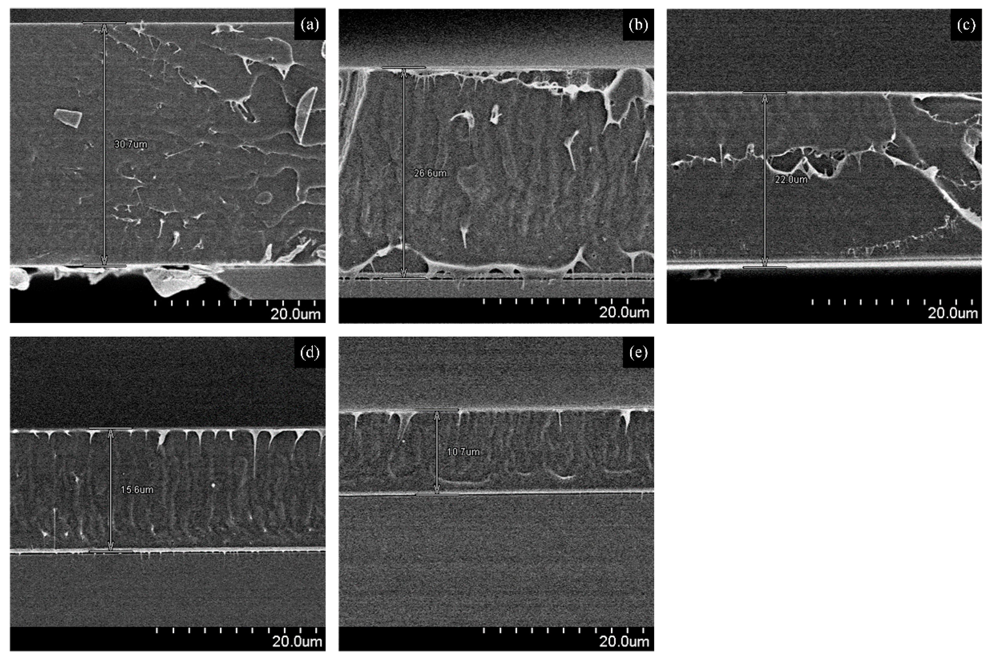 SEM images of different IDC dielectric/sensing membrane thicknesses: (a) 30.7 µm; (b) 26.6 µm; (c) 22.0 µm; (d) 15.6 µm; and (e) 10.7 µm.